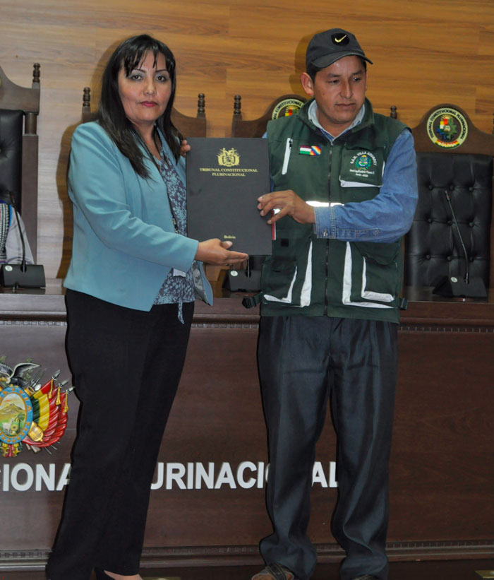 Similar criterio expresó el Secretario General del municipio de Azurduy, Diego Martínez Ávalos, quien recordó que su proyecto de COM ingresó al Tribunal Constitucional Plurinacional de Bolivia el 2014. Tras el control de constitucionalidad, esta institución devolvió con observaciones en varias oportunidades y finalmente hoy recibieron la DPC 006/2018 de 14 de marzo.