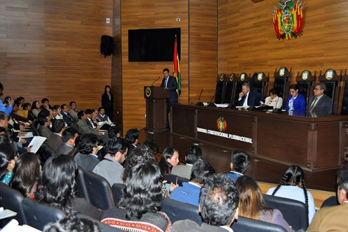 El Tribunal Constitucional Plurinacional (TCP) de Bolivia recibió la visita de Josep Aguiló Regla, Docente de Filosofía del Derecho de la Universidad de Alicante, España con quien se llevó a cabo la Conferencia: “Positivismo y postpositivismo. Dos paradigmas jurídicos en pocas palabras”. René Yván Espada Navía, Magistrado del TCP, elegido por el departamento de Pando, presentó al profesor Aguiló mencionando su trayectoria profesional y destacando las publicaciones a su cargo. La amplia experiencia de Aguiló en el ámbito académico permitió a través de la exposición y ejemplificación del contenido, sentar una clara diferencia del llamado modelo del imperio de la Ley o positivismo y el modelo del Estado de Derecho o postpositivismo. La Conferencia estuvo destinada a las servidoras y servidores públicos del TCP, a las Magistradas y Magistrados del Tribunal Agroambiental e invitados especiales, que siguieron con atención la intervención del docente, quien al finalizar permitió acceder a las consultas de los asistentes. [img]/tcp/sites/default/files/images/Comunicacion/SEMINARIO-2.jpg[/img] En mérito a la labor académica que realiza en Latinoamérica y en esta visita especial a Bolivia y al TCP, la MSc. Julia Elizabeth Cornejo Gallardo, Magistrada del Tribunal elegida por el departamento de Tarija, agradeció el tiempo otorgado por Aguiló, haciendo entrega de un reconocimiento a nombre de la institución. Finalmente, fue la MSc. Georgina Amusquivar Moller, Magistrada del TCP elegida por el departamento de Oruro, quien obsequió la Constitución Política del Estado Plurinacional de Bolivia al renombrado docente.