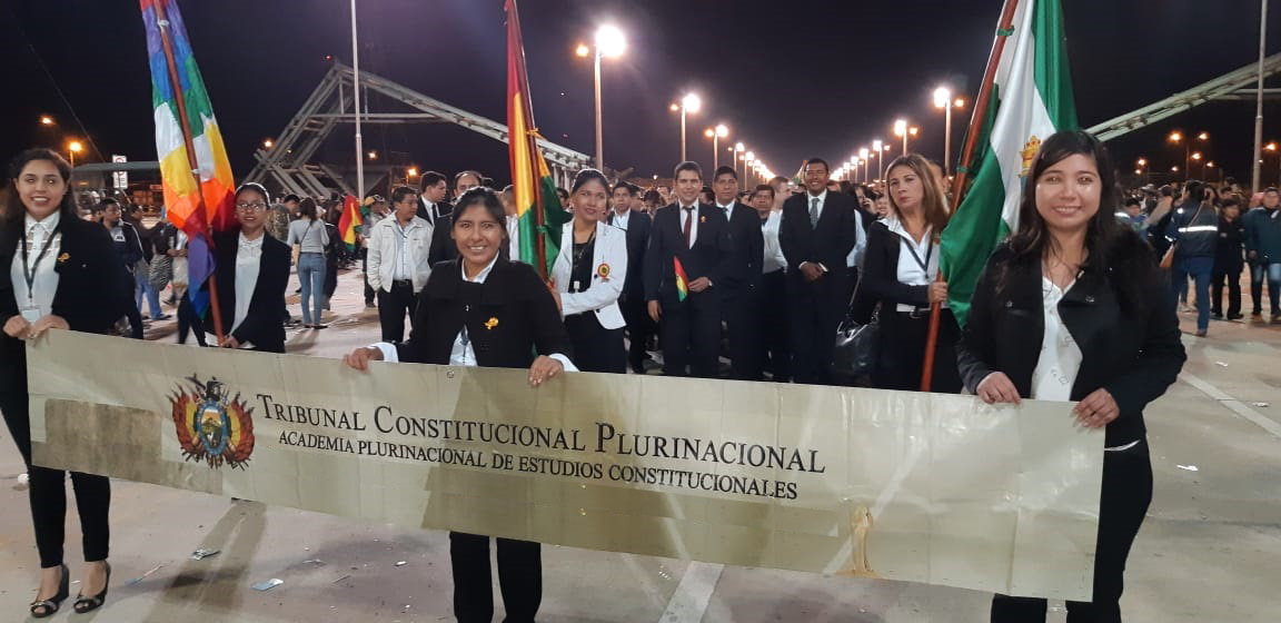 El Magistrado Calderón acompañado por una comitiva de servidoras y servidos públicos del TCP de Bolivia, hicieron su paso por el palco oficial portando la tricolor nacional y la bandera del departamento de Santa Cruz.
