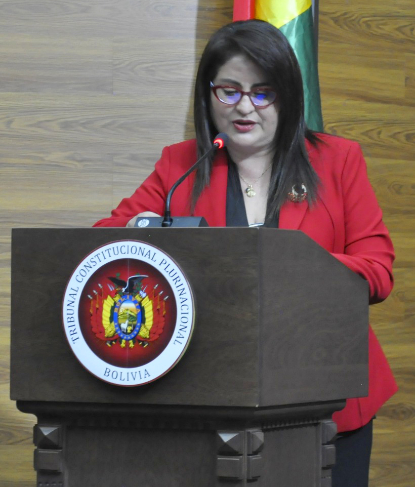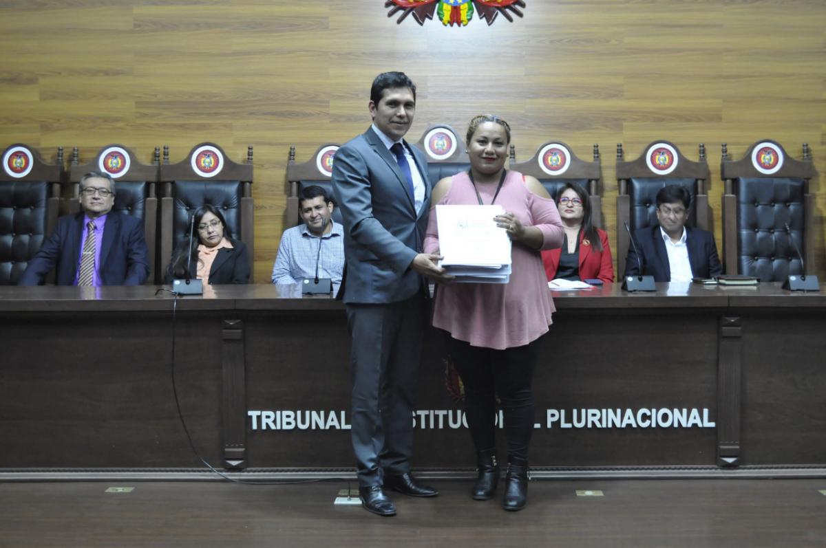 En el acto realizado para la ocasión, la MSc. Karem Lorena Gallardo Sejas, Magistrada elegida por el departamento de Cochabamba, dio la bienvenida a las autoridades municipales que arribaron a la ciudad de Sucre para hacer entrega del documento.
