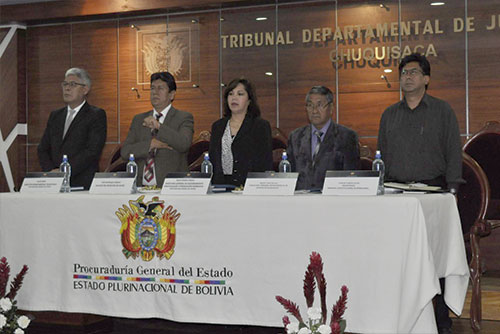 La presentación del mencionado dictamen se realizó en el Salón de Honor del Tribunal Departamental de Justicia de Chuquisaca y contó con la presencia del Ing. Iván Jorge Arciénega Collazos, Alcalde del Gobierno Autónomo Municipal de Sucre, Dr. Natalio Tarifa Tarifa, Sub Decano de dicho Tribunal de Justicia, Dr. Lucio Valda Martínez, Director Departamental de Chuquisaca de la Procuraduría General del Estado y profesionales del área del derecho.