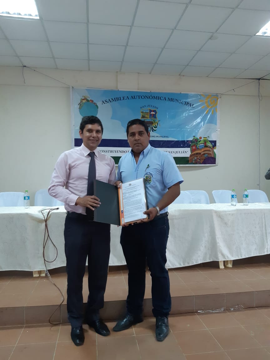 El MSc. Carlos Alberto Calderón Medrano, Magistrado electo por Santa Cruz del TCP de Bolivia, hizo entrega de la DCP a Dilfe Rentería Aratea Presidente del Concejo del Gobierno Autónomo Municipal de San Julián a tiempo de mencionar que tras el trabajo coordinado entre ambas instituciones, se pudo realizar la verificación de compatibilidad del Proyecto de la Carta Orgánica con la Constitución Política del Estado.