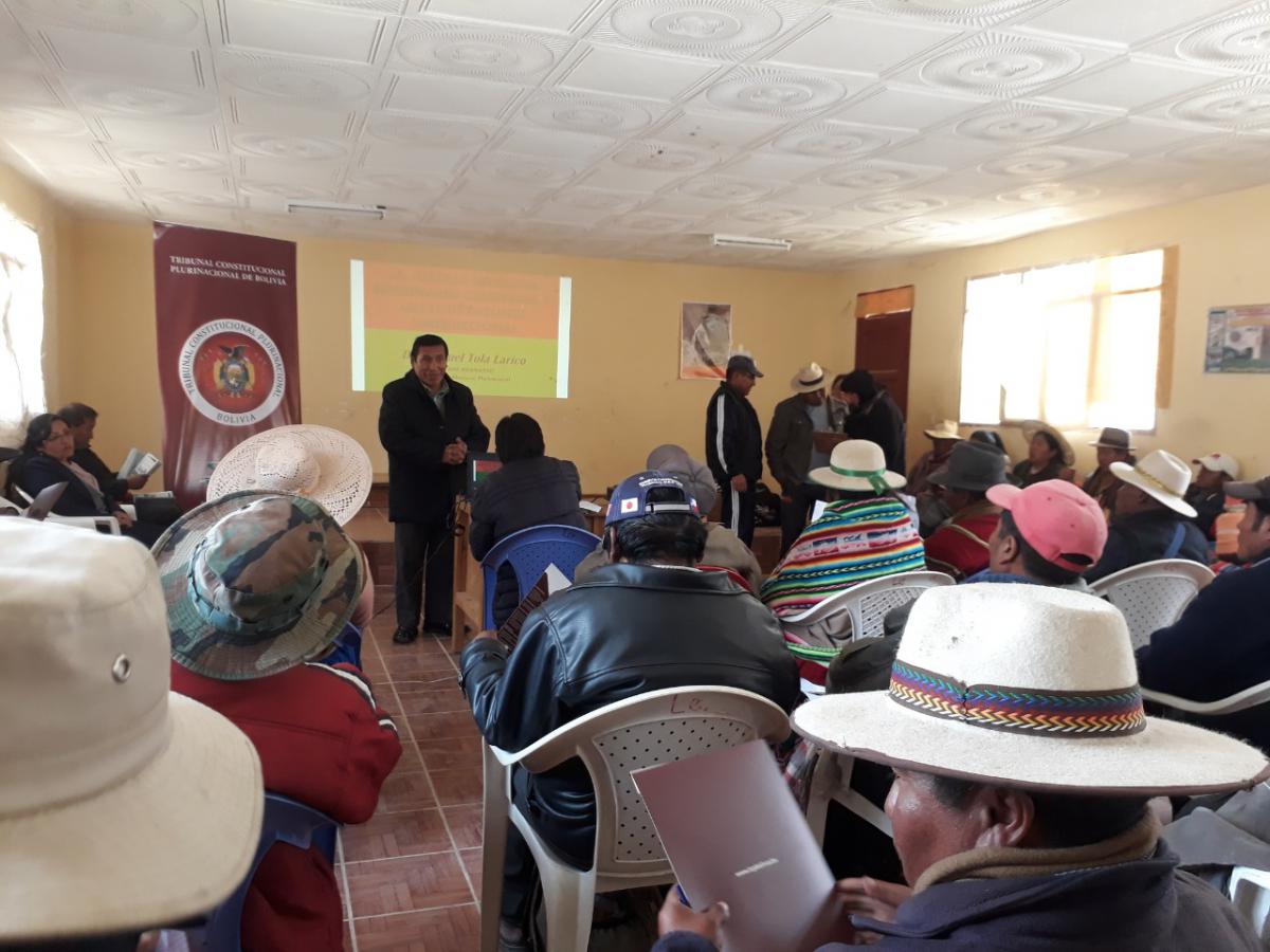 En el marco de las actividades académicas que realiza el Tribunal Constitucional Plurinacional (TCP) de Bolivia, a iniciativa de la MSc. Georgina Amusquivar Moller, Magistrada electa por Oruro, se desarrolló el Curso Taller sobre “Jurisdicción Indígena Originaria Campesina” dirigido a las autoridades campesinas de la Central de Lequepalca del municipio de Paria del departamento de Oruro.