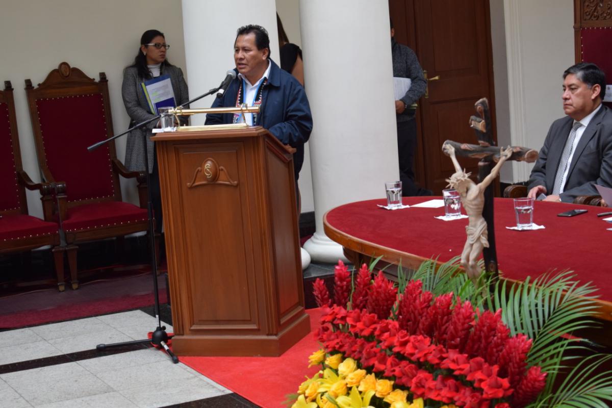 En palabras de circunstancia, el Dr. Petronilo Flores Condori, Presidente del Tribunal Constitucional Plurinacional (TCP) de Bolivia incitó a las nuevas autoridades a cumplir sus funciones con dedicación, evitando cualquier acto de corrupción.
