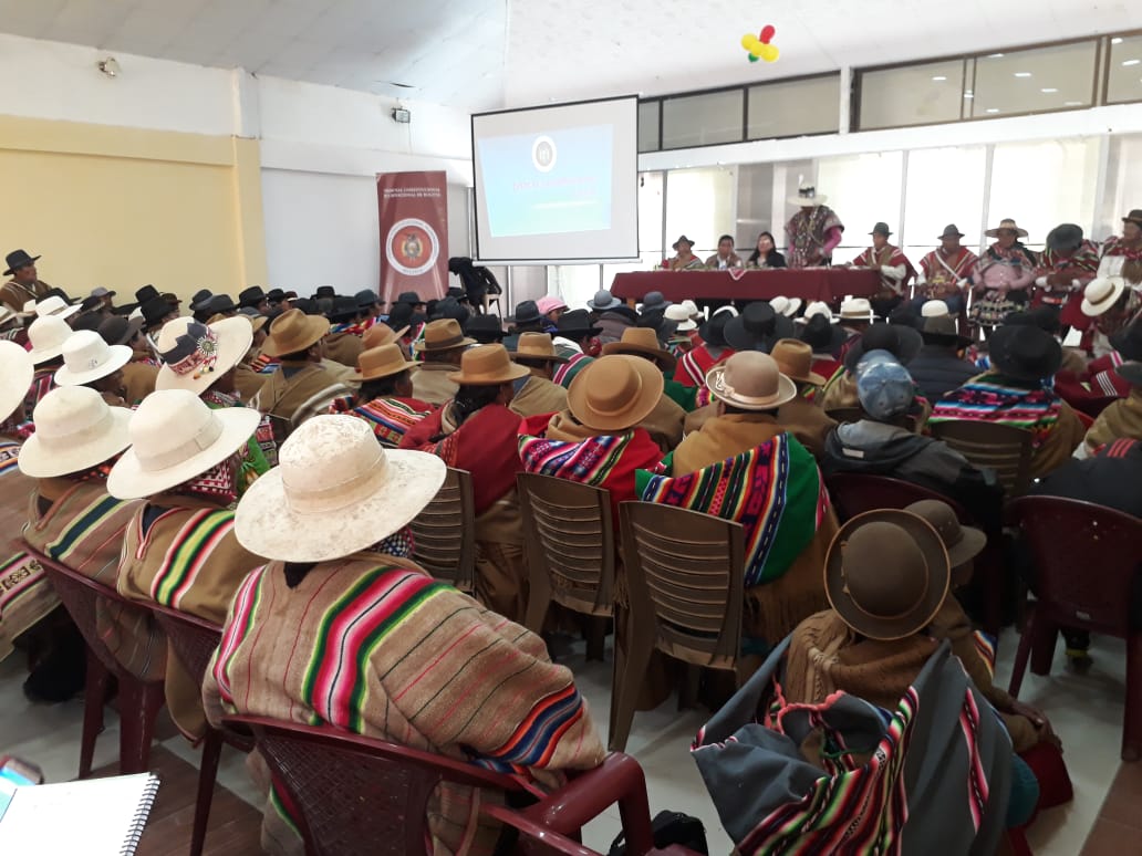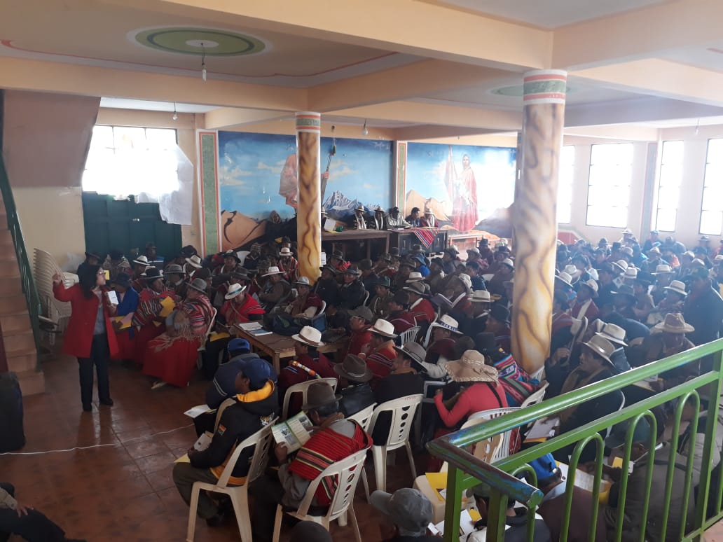 El taller estuvo dirigido a autoridades originarias y líderes de comunidades pertenecientes a ambos municipios, fueron realizados en el auditorio de la Dirección Distrital de Educación de Challapata y en ambientes de la Federación Sindical Originaria Regional de Caracollo (FESORC) respectivamente.