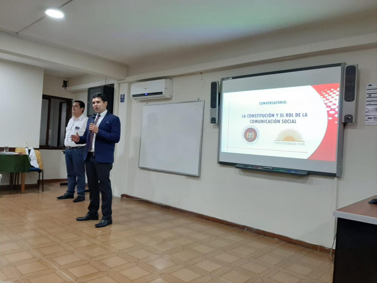 El Tribunal Constitucional Plurinacional (TCP) de Bolivia, representado por el MSc. Carlos Alberto Calderón Medrano, Magistrado electo por el departamento de Santa Cruz, en coordinación con las autoridades académicas de la Universidad NUR, se realizó la Conferencia denominada “La Constitución y el Rol de la Comunicación”, realizada en el Aula 316 de la mencionada Casa Superior de Estudios, en la ciudad de Santa Cruz de la Sierra.