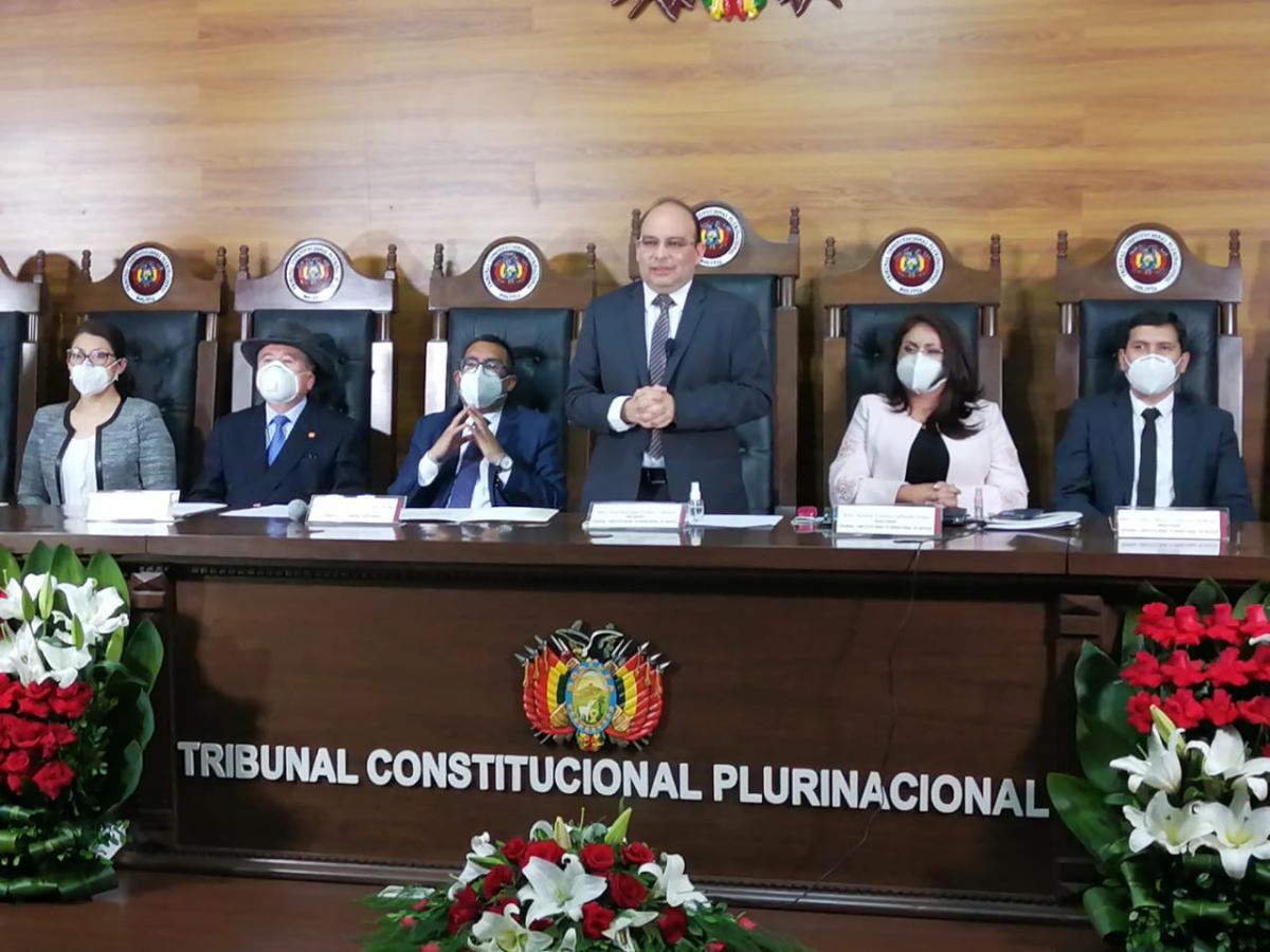 El acto estuvo precedido por el MSc. Paul Enrique Franco Zamora, la MSc. Karem Lorena Gallardo Sejas, la MSc. Julia Elizabeth Cornejo Gallardo, el MSc. Carlos Alberto Calderón Medrano; Presidente, Magistradas y Magistrado del TCP de Bolivia, además de autoridades académicas.