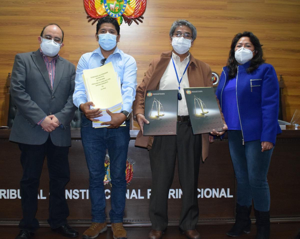 Una delegación de autoridades ediles del Municipio paceño de Tipuani recibió hoy la Declaración de Constitucionalidad de su Carta Orgánica, de manos del Presidente del Tribunal Constitucional Plurinacional (TCP), MSc. Paul Enrique Franco Zamora y su colega MSc. Brigida Celia Vargas Barañado, Magistrada electa por el departamento de La Paz.