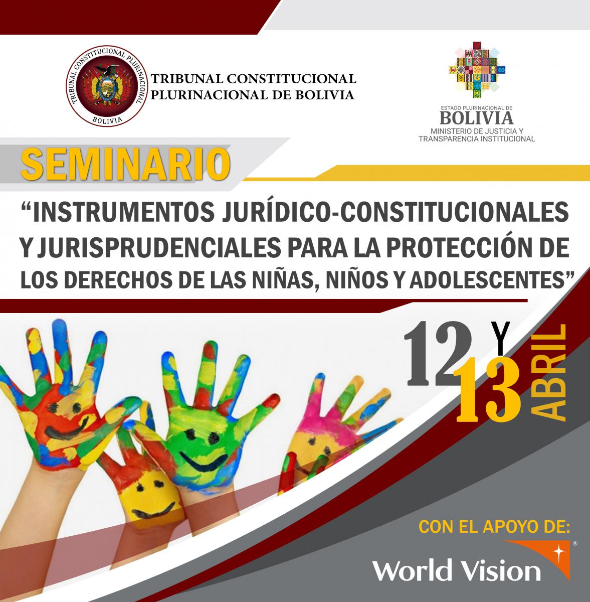 A pocos día de celebrar el Día de la Niña y del Niño en Bolivia, el Tribunal Constitucional Plurinacional, en coordinación con el Ministerio de Justicia y Transparencia Institucional y la ONG Visión Mundial, tienen el agrado de comunicar la organización del SEMINARIO: “INSTRUMENTOS JURÍDICO-CONSTITUCIONALES Y JURISPRUDENCIALES PARA LA PROTECCIÓN DE LOS DERECHOS DE LAS NIÑAS, NIÑOS Y ADOLESCENTES”, cuyos expositores (nacionales e internacionales) pretenden un acercamiento pedagógico, respecto a los criterios normativos con la aplicación del bloque de constitucionalidad, además de otros aspectos teórico-prácticos y aportes provenientes de la jurisprudencia.