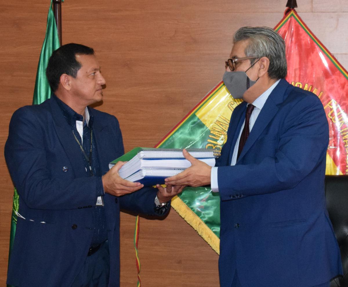 El Magistrado electo por el departamento del Beni, Gonzalo Miguel Hurtado Zamorano, junto a su colega Magistrado Carlos Alberto Calderón Medrano, electo por el departamento de Santa Cruz, fueron las autoridades constitucionales que recibieron a la delegación beniana encabezada por el Lic. Ronald Rosas Heredia, Presidente del Concejo Municipal de Trinidad.