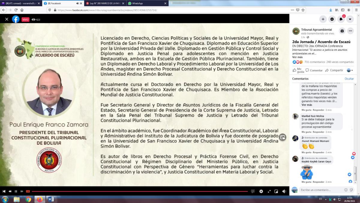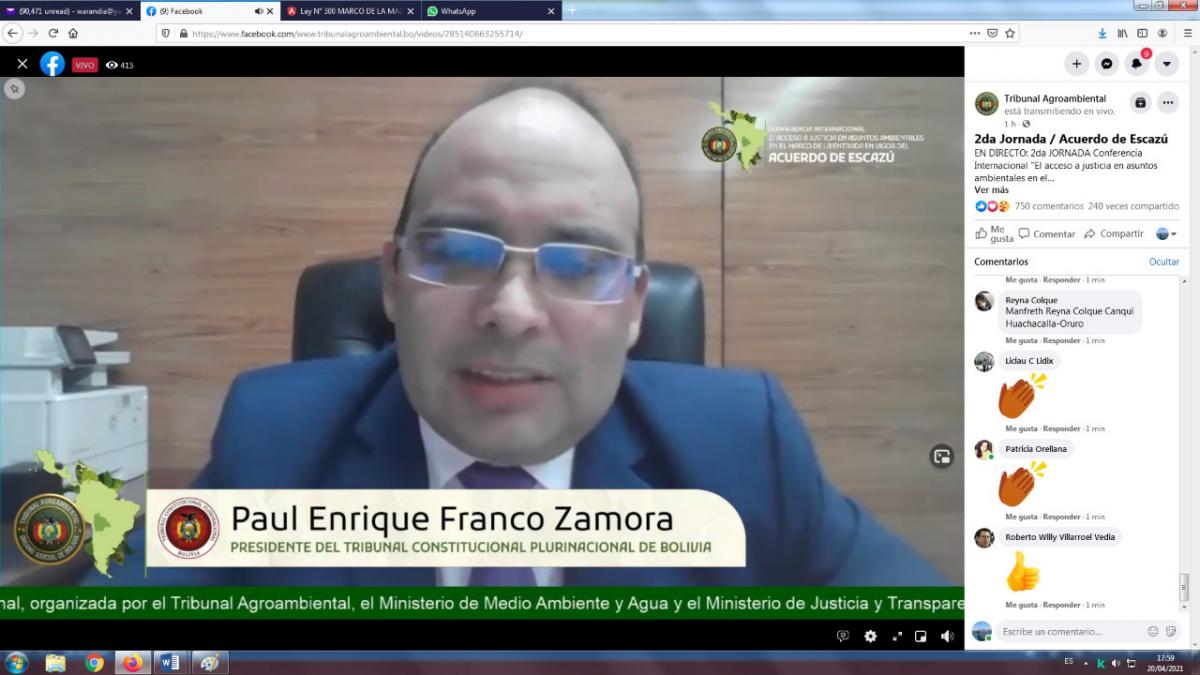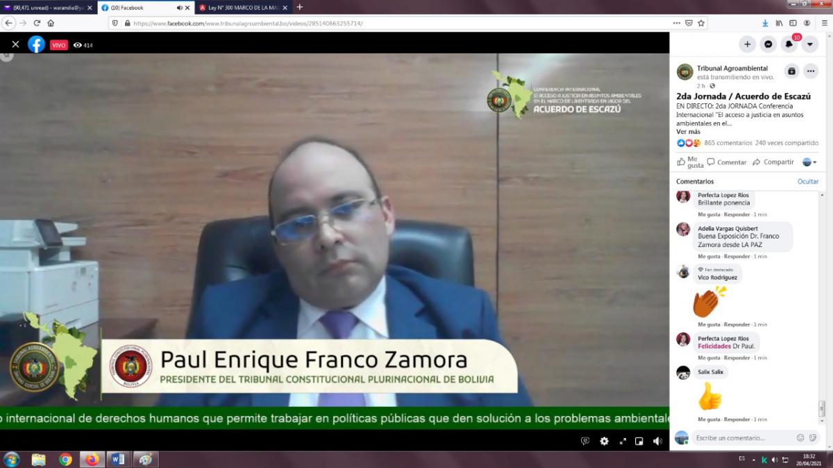 En representación del Tribunal Constitucional Plurinacional (TCP), su Presidente MSc. Paul Enrique Franco Zamora, expuso sobre “La justicia constitucional y la justicia agroambiental en Bolivia” en el marco de la Conferencia Internacional “Acceso a justicia en asuntos ambientales en el marco de la entrada en vigor del Acuerdo de Escazú”, organizado por el Tribunal Agroambiental.