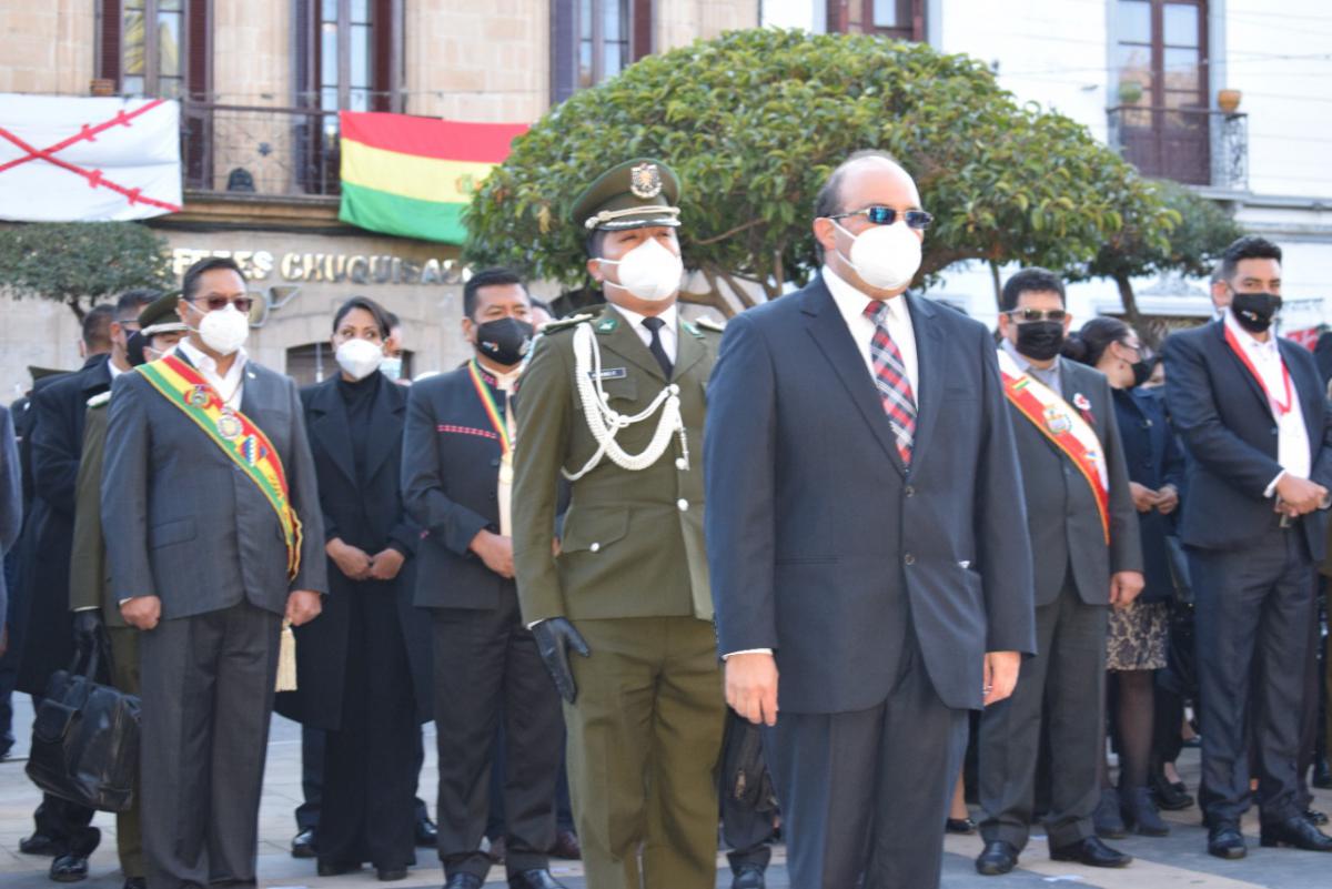 Luego de la entrega de las Ofrendas Florales, la comitiva oficial de autoridades se dirigió hasta el frontis de la Casa de la Libertad donde se realizó la Iza de la Bandera en conmemoración al aniversario cívico chuquisaqueño.