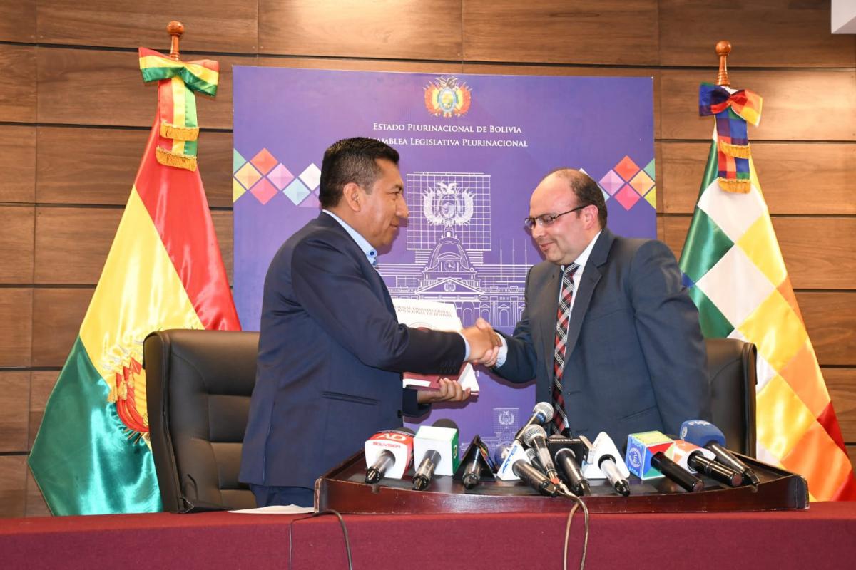 El Presidente del Tribunal Constitucional Plurinacional, MSc. Paul Enrique Franco Zamora, a nombre de la Sala Plena, hizo entrega al Presidente de la Cámara de Diputados Freddy Mamani, el “Proyecto de Ley Orgánica de la Jurisdicción Constitucional” y el “Proyecto de Ley de Modificación a la Ley N° 254 de 5 de julio de 2012 Código Procesal Constitucional”, elaborados y presentados en el marco de la atribución prevista en el art. 28.II.3 de la actual Ley del Tribunal Constitucional Plurinacional para su tratamiento legislativo constitucional.