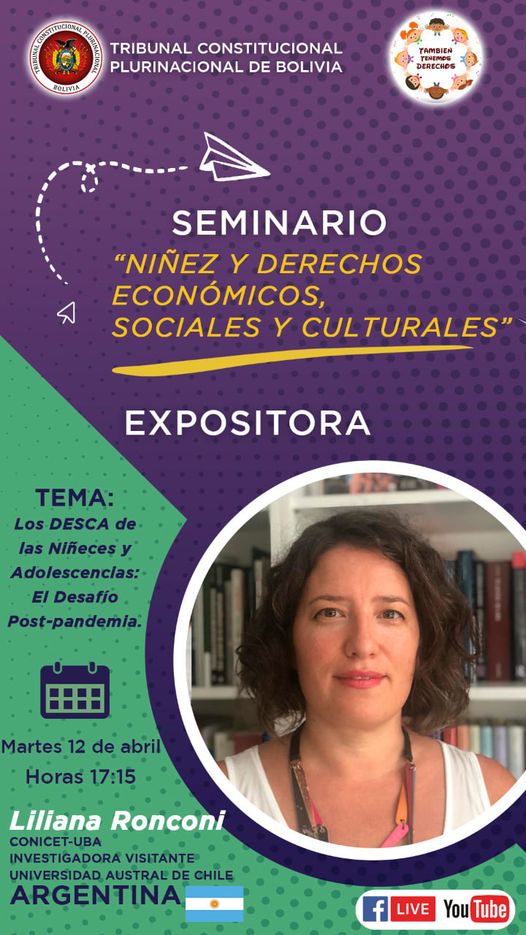 EN EL SEMINARIO «NIÑEZ Y DERECHOS ECONÓMICOS, SOCIALES Y CULTURALES», EL 12 DE ABRIL CONTAMOS CON LA PARTICIPACIÓN DE LILIANA RONCONI, CONICET – UBA, INVESTIGADORA VISITANTE DE LA UNIVERSIDAD AUSTRAL DE CHILE Publicación de la entrada:12 de abril de 2022 Categoría de la entrada:Noticias https://forms.gle/ipDzeTMXuCWZKdFV8 Etiquetas: Noticias Leer más artículos Entrada anteriorTE PRESENTAMOS EL PROGRAMA GENERAL DEL SEMINARIO VIRTUAL: «NIÑEZ Y DERECHOS ECONÓMICOS, SOCIALES Y CULTURALES», A REALIZARSE LOS DÍAS 12 Y 13 DE ABRIL CON LA PARTICIPACIÓN DE PROFESIONALES EXPERTOS/AS EN LA TEMÁTICA INFANTIL Siguiente entradaSEGUNDA JORNADA DEL SEMINARIO «NIÑEZ Y DERECHOS ECONÓMICOS, SOCIALES Y CULTURALES», CON LA PARTICIPACIÓN DE EXPERTAS Y EXPERTOS PROFESIONALES EN LA TEMÁTICA DE DERECHOS DE LA NIÑEZ También podría gustarte EN HOMENAJE AL DÍA DEL ABOGADO TCP DESARROLLA CICLO DE ACTUALIZACIÓN JURÍDICA CON EL CURSO VIRTUAL “JURISPRUDENCIA CONSTITUCIONAL” 12 de octubre de 2023 TCP DE BOLIVIA REALIZÓ LA ENTREGA DE DECLARACIÓN CONSTITUCIONAL PLURINACIONAL DE LA CARTA ORGÁNICA DEL GOBIERNO AUTÓNOMO MUNICIPAL DE TARATA – COCHABAMBA 20 de diciembre de 2020 Magistrado Ceballos participó como Expositor en el Taller Internacional de Género que se realiza en Sucre 17 de diciembre de 2018