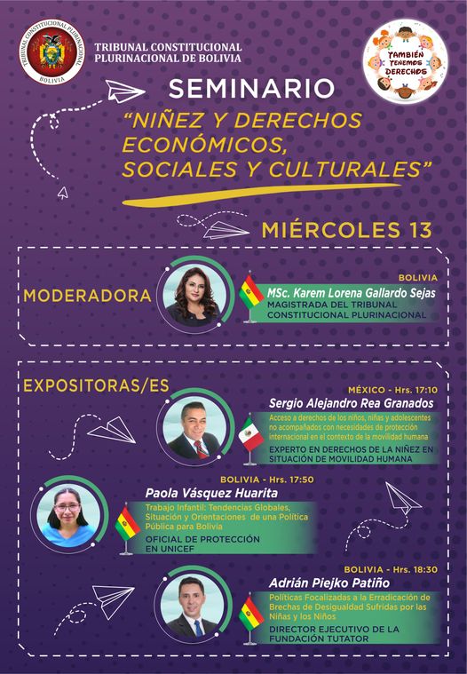 SEGUNDA JORNADA DEL SEMINARIO «NIÑEZ Y DERECHOS ECONÓMICOS, SOCIALES Y CULTURALES», CON LA PARTICIPACIÓN DE EXPERTAS Y EXPERTOS PROFESIONALES EN LA TEMÁTICA DE DERECHOS DE LA NIÑEZ Publicación de la entrada:12 de abril de 2022 Categoría de la entrada:Noticias TE INVITAMOS A PARTICIPAR EN ESTE IMPORTANTE EVENTO ACADÉMICO DESDE LAS 17:00 HORAS. Etiquetas: Noticias Leer más artículos Entrada anteriorEN EL SEMINARIO «NIÑEZ Y DERECHOS ECONÓMICOS, SOCIALES Y CULTURALES», EL 12 DE ABRIL CONTAMOS CON LA PARTICIPACIÓN DE LILIANA RONCONI, CONICET – UBA, INVESTIGADORA VISITANTE DE LA UNIVERSIDAD AUSTRAL DE CHILE Siguiente entradaDESCARGUE EL BOLETÍN INFORMATIVO DIGITAL DEL TRIBUNAL CONSTITUCIONAL PLURINACIONAL «JUSTICIA CONSTITUCIONAL DESDE LA ÓPTICA DE LOS DERECHOS DE LA NIÑEZ Y ADOLESCENCIA» , ACCEDIENDO AL SIGUIENTE ENLACE: También podría gustarte EN SEMINARIO INTERNACIONAL SOBRE DERECHOS DE LA NIÑEZ, TCP PRESENTÓ BOLETÍN INSTITUCIONAL DIGITAL 14 de abril de 2022 Magistrado Calderón repartió obsequios en Navidad en el barrio Vietnam 27 de diciembre de 2018 Seminario dedicado a la niñez y adolescencia logró importante convocatoria 14 de abril de 2021