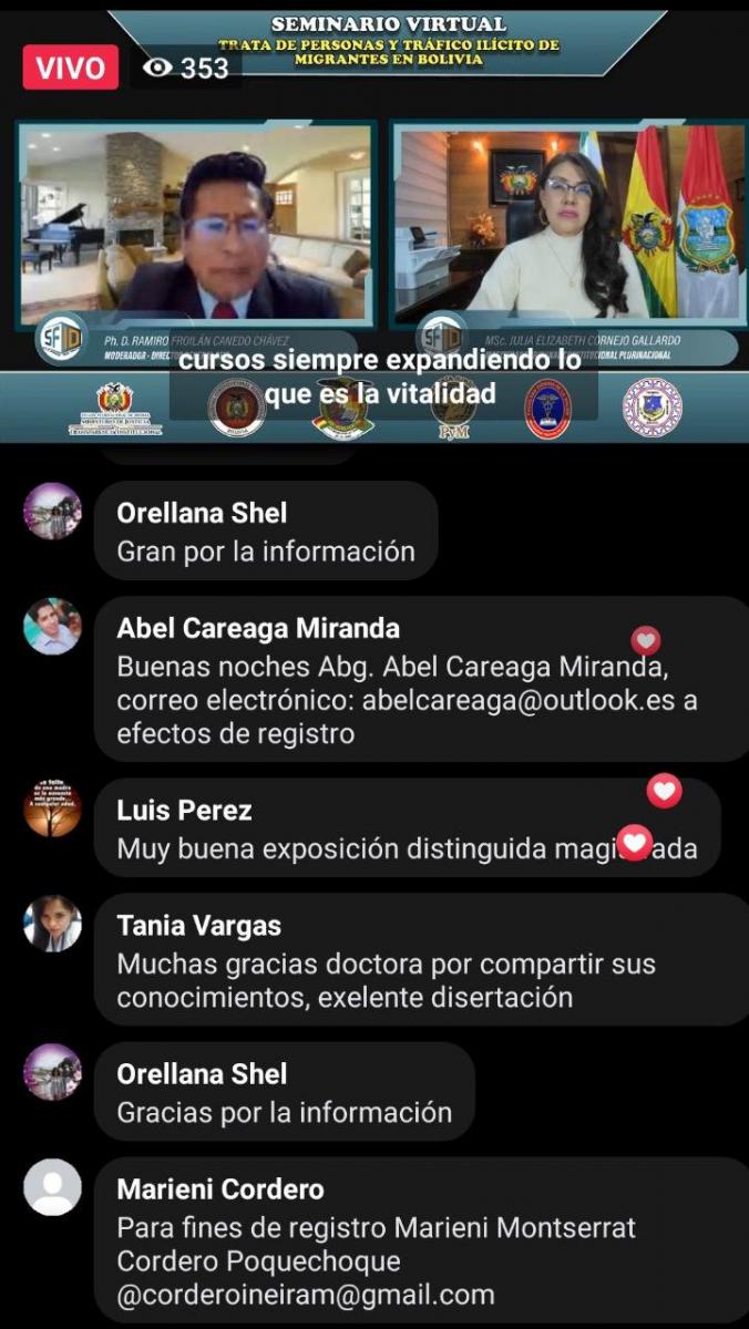 La autoridad, a tiempo de agradecer la invitación al SFID, así como de las instituciones de Oruro y La Paz, señaló que el magno evento académico gratuito fue desarrollado el miércoles 18 de mayo de 2022 y transmitido en directo vía zoom, Facebook y YouTube, redes sociales de los organizadores, para tratar la situación de personas que están siendo afectadas por la temática, y que no cuentan con la información necesaria para no ser víctimas de estos delitos que flagelan a la sociedad.