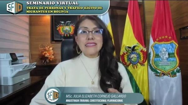 Plurinacional, electa por el departamento de Tarija, MSc. Julia Elizabeth Cornejo Gallardo, participó como expositora en el seminario virtual: “Trata de personas y tráfico ilícito de migrantes en Bolivia”, a invitación de la Sociedad de Formación, Investigación y Digitalización (SFID) -sin fines de lucro-, en coordinación con el Ministerio de Justicia y Transparencia Institucional, Universidad Pública Autónoma de El Alto (UPEA) e instituciones colegiadas a nivel nacional.