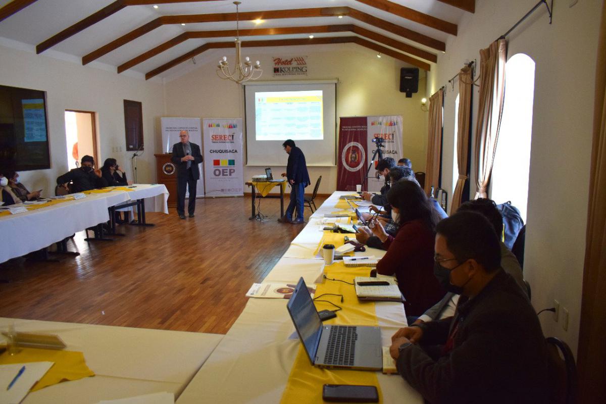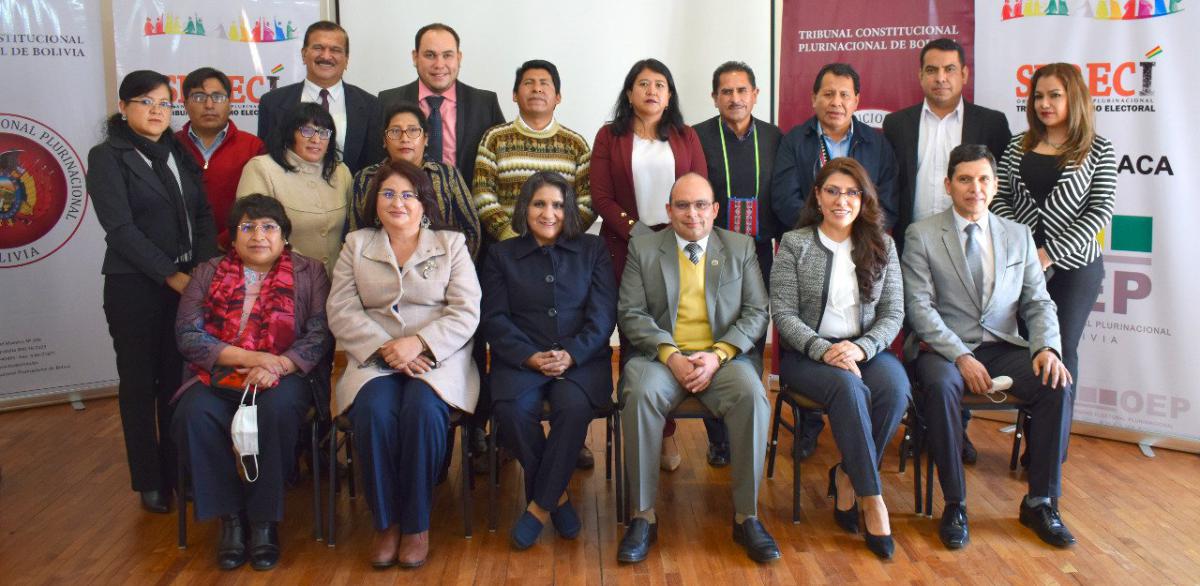 Autoridades del Tribunal Constitucional Plurinacional (TCP), del Tribunal Supremo Electoral (TSE) y de los Tribunales Electorales Departamentales (TED) de Chuquisaca, Pando, Santa Cruz, La Paz, Potosí y Oruro, junto al equipo técnico de ambas instituciones, sostuvieron esta jornada en la ciudad de Sucre, un diálogo interinstitucional donde analizaron los mecanismos de protección jurisdiccional de las Naciones y Pueblos Indígena Originario Campesinos (NyPIOC), para el ejercicio y promoción de la democracia comunitaria.