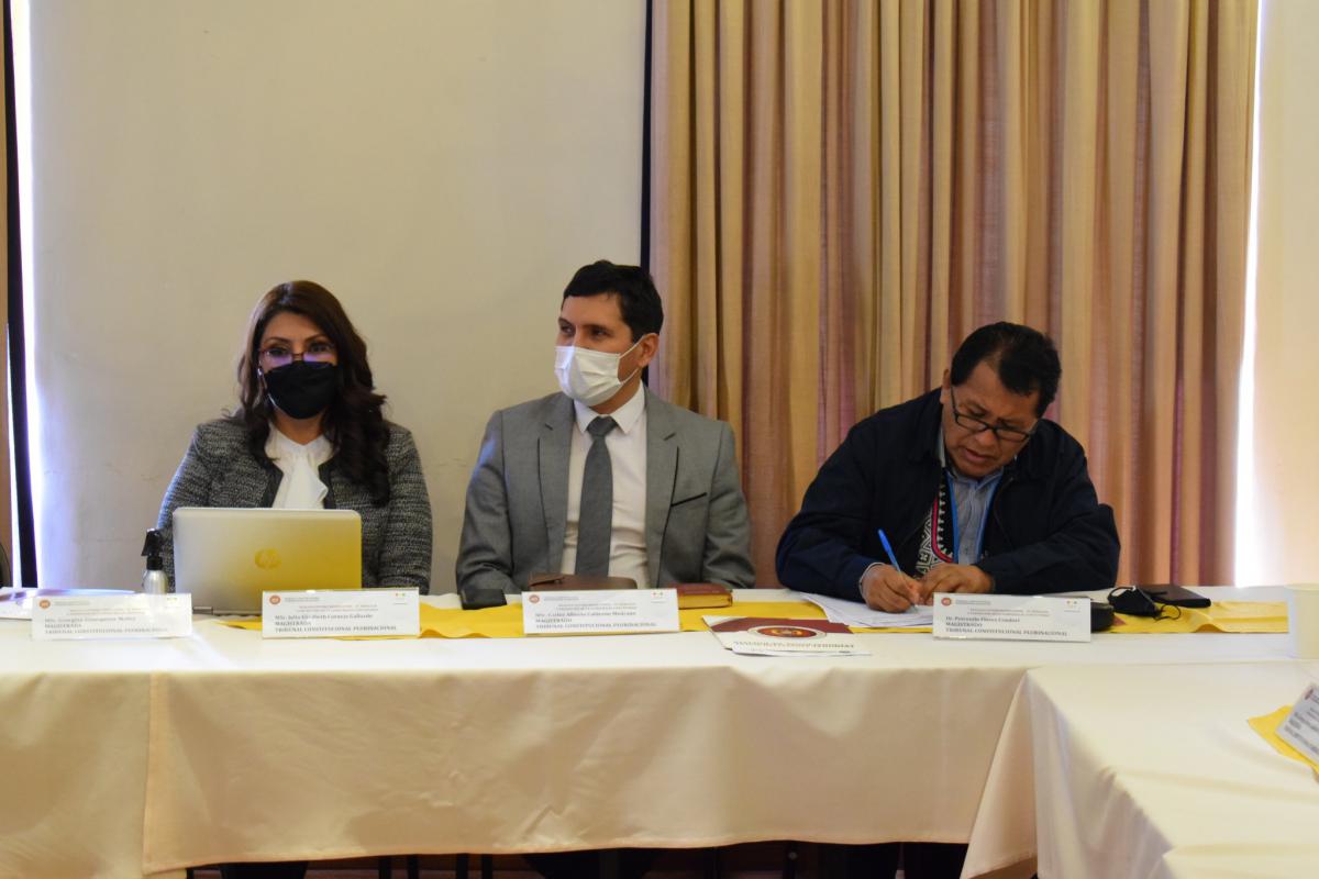 De acuerdo al programa de trabajo, durante la jornada se efectuó la presentación de ponencias respecto a la materia, destacando la intervención del Magistrado del TCP, MSc. Carlos Alberto Calderón Medrano, con la exposición “Democracia comunitaria en el Estado Plurinacional de Bolivia” y de la Magistrada, MSc. Julia Elizabeth Cornejo Gallardo, con el tema “El pluralismo jurídico en la jurisprudencia constitucional sobre los derechos de las Naciones y Pueblos Indígena Originario Campesinos”, presentaciones que favorecieron el análisis sobre la promoción y protección de los derechos humanos de las NyPIOC.