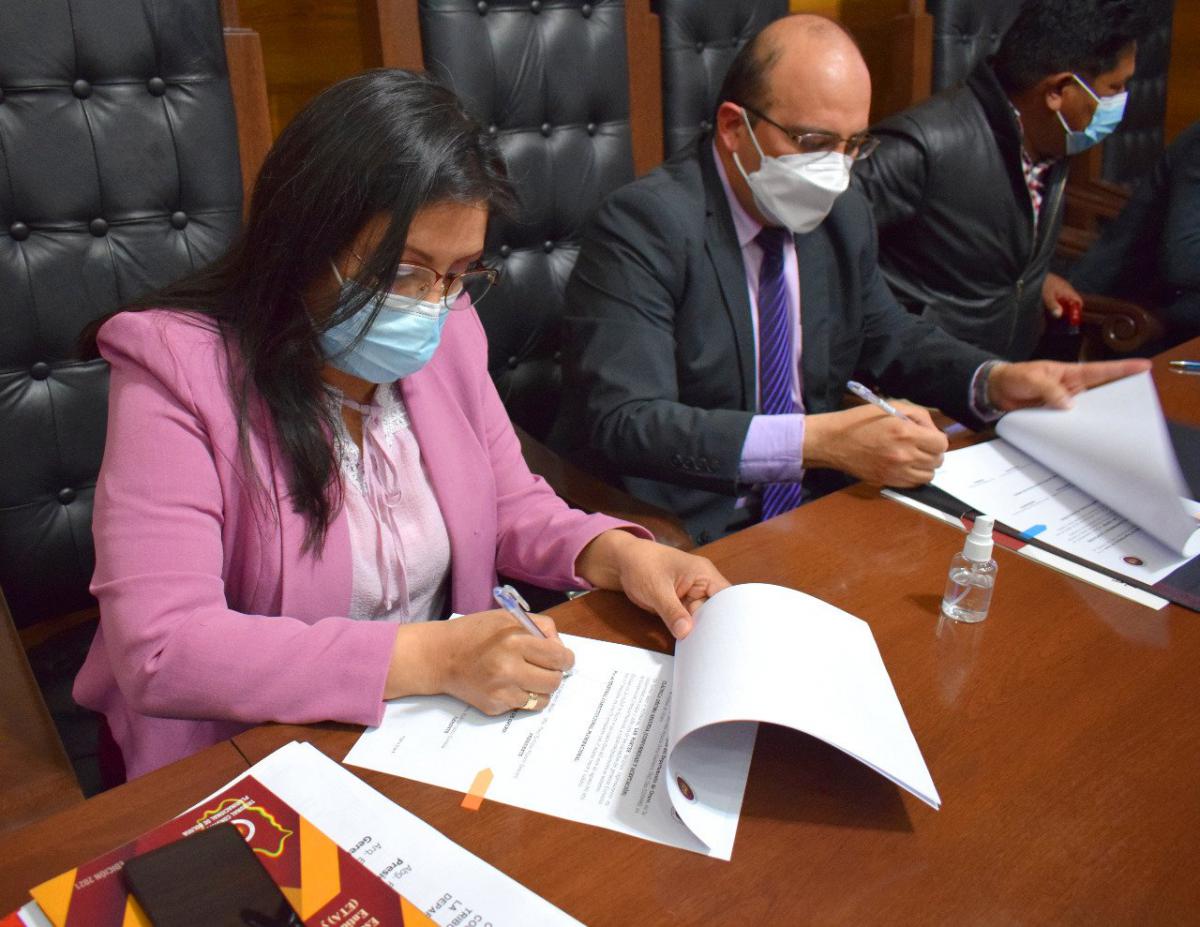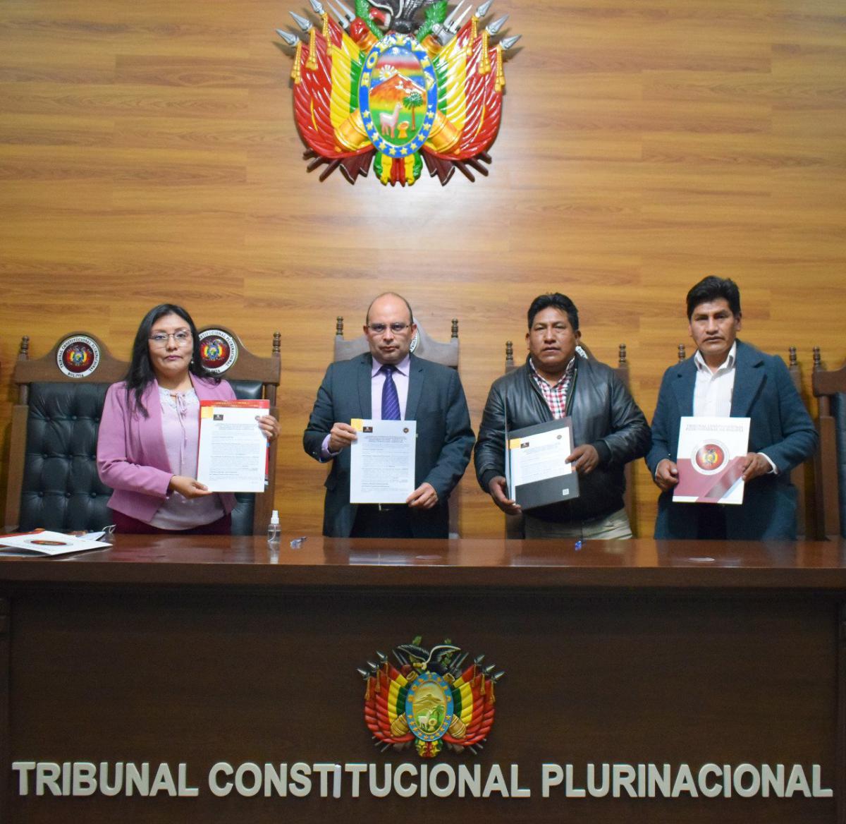 Autoridades del Tribunal Constitucional Plurinacional (TCP) y de la Asociación de Municipios del Departamento de Oruro (AMDEOR) suscribieron, hoy jueves 4 de agosto, un convenio de cooperación interinstitucional que permita promover la realización de actividades de forma conjunta, para mejorar la gestión pública autonómica a través de iniciativas de formación, socialización y capacitación.