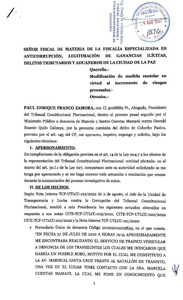 Informó que, el día de ayer, jueves 4 de agosto a horas 10:16 presentó en Plataforma de Atención al Público de la Fiscalía Departamental de Chuquisaca, la querella contra el ex servidor de esa institución, Oswald Roamir Quilo Calizaya.