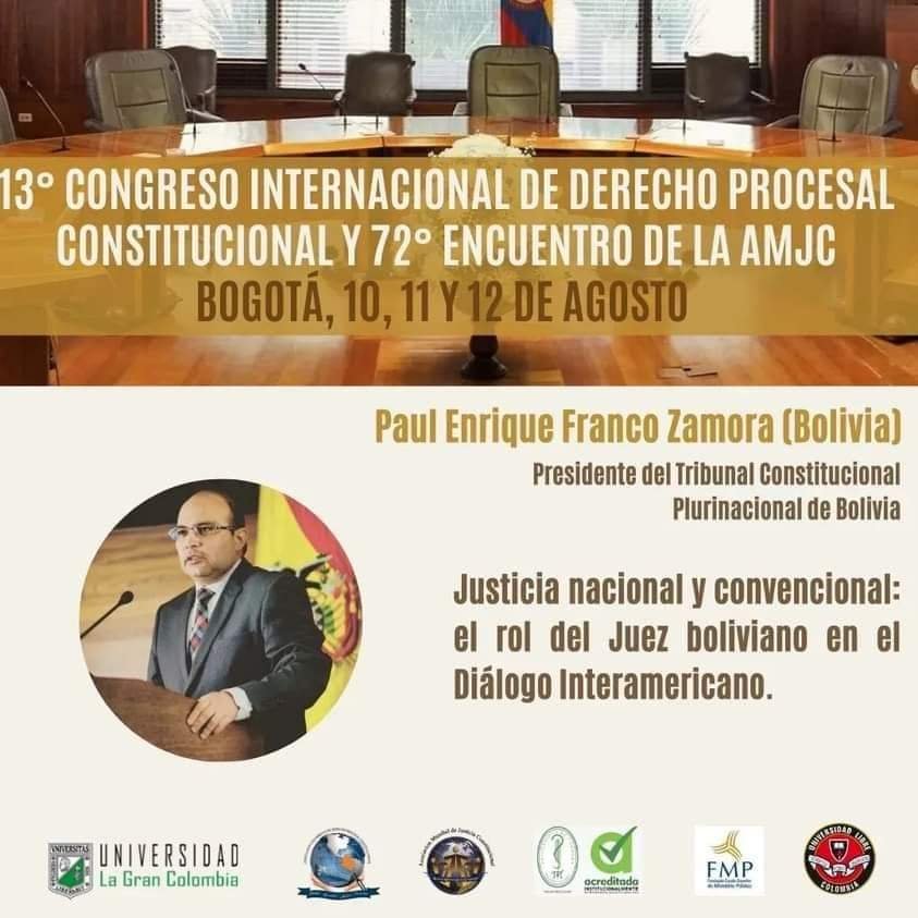 Actividad académica organizada por la Universidad La Gran Colombia, donde participa el Presidente del Tribunal Constitucional Plurinacional, MSc. Paul Enrique Franco Zamora, con la ponencia: «Justicia nacional y convencional: el rol del Juez boliviano en el Díalogo Interamericano».