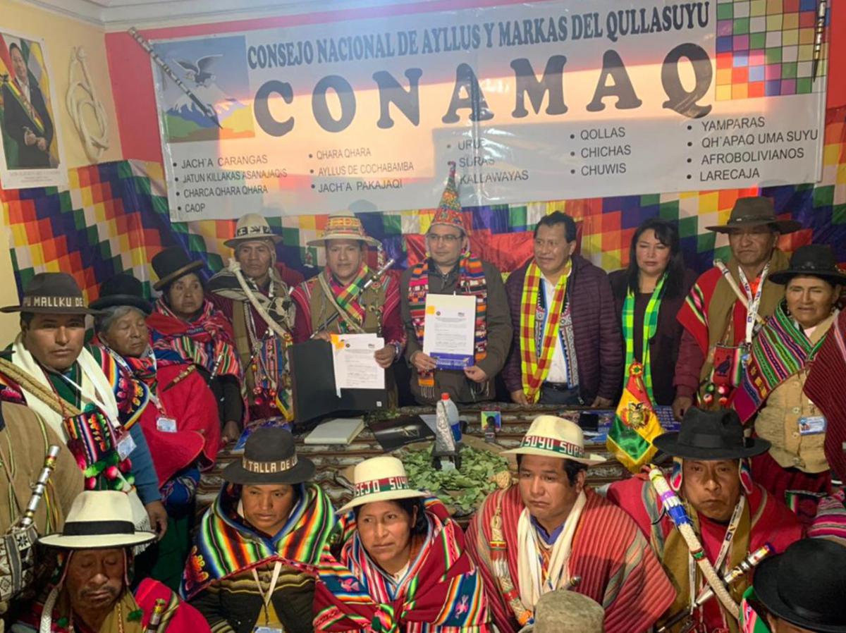 Autoridades del Tribunal Constitucional Plurinacional (TCP) y del Consejo Nacional de Ayllus y Markas del Qullasuyo (CONAMAQ), suscribieron esta jornada en la ciudad de La Paz, un convenio de cooperación interinstitucional e interjurisdiccional, con el propósito de fortalecer el trabajo conjunto y coordinado sobre temas relacionados con la Justicia Indígena Originaria Campesina, la Justicia Constitucional y los Derechos Humanos.