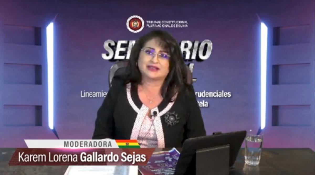 La Magistrada, MSc. Karem Lorena Gallardo Sejas, en su condición de Moderadora del Seminario, señaló que éste congrega a connotados profesionales del Derecho Procesal Constitucional de: Argentina, Bolivia, Colombia, Ecuador, Paraguay y Perú, profesionales que contribuirán al fortalecimiento de las capacidades de los participantes, promoviendo el análisis, debate y reflexión relacionados preferentemente al catálogo de las acciones de defensa.