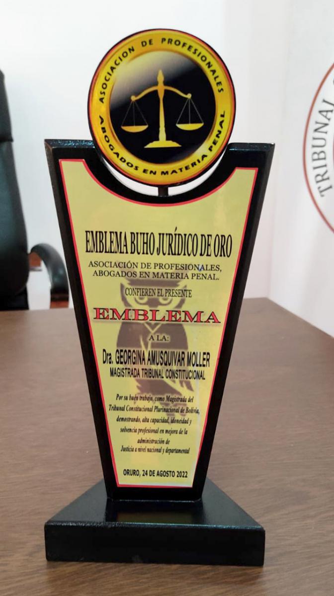 Con el emblema “BUHO JURÍDICO DE ORO», la Asociación de Profesionales Abogados en Materia Penal de Oruro, reconoció la destacada labor desarrollada por la Magistrada del Tribunal Constitucional Plurinacional (TCP), MSc. Georgina Amusquivar Moller.