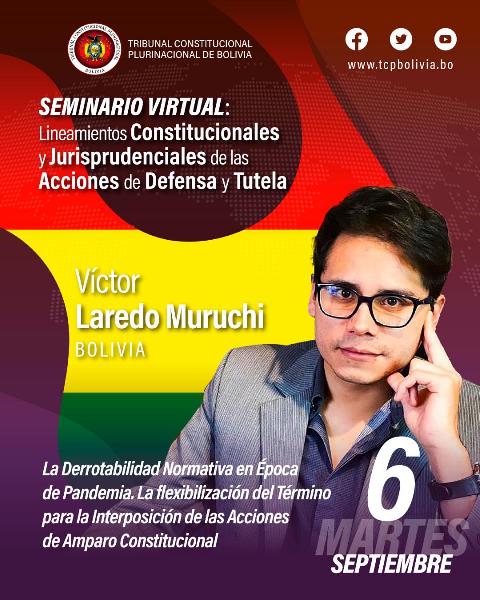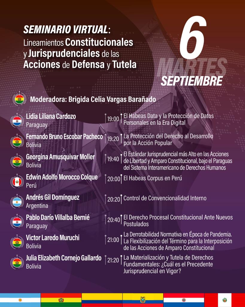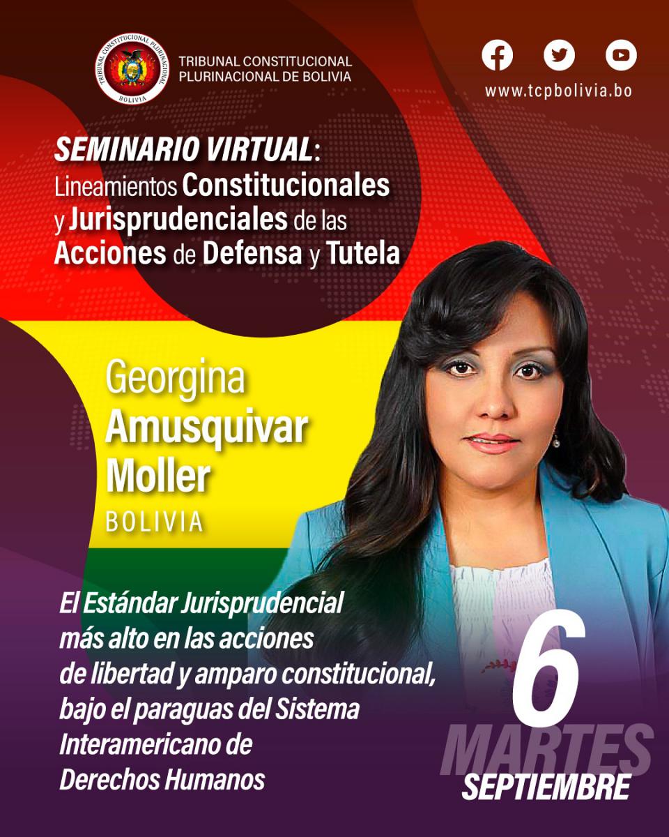 Hoy en el aula virtual del Tribunal Constitucional Plurinacional de Bolivia se desarrolla la segunda jornada del Seminario Internacional “Lineamientos Constitucionales y Jurisprudenciales de las Acciones de Defensa y Tutela”. 6 de septiembre 2022 De 19:00 a 21:50 horas Certificación con valor curricular