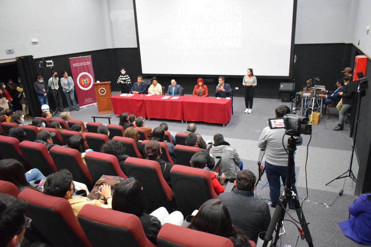 Con mucha expectativa y aceptación de la población, el Tribunal Constitucional Plurinacional inauguró ayer, miércoles 14 de septiembre, la primera Jornada de Cultura Constitucional “Literatura, Derechos Humanos, Arte y Cine” con el Panel denominado: “Existencia Digna a través del Cine y el Derecho” y la proyección de la película boliviana “Insurgentes” del director Jorge Sanjinés.
