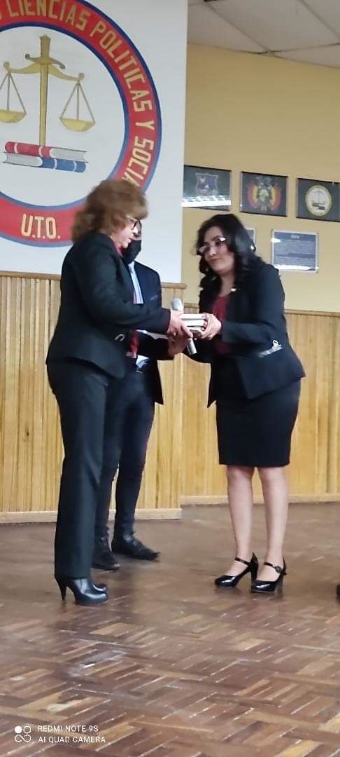 En la ocasión, la presidenta de la Asociación de Mujeres Profesionales Abogadas de Oruro “A.M.P.A.O.”, Dra. Josefina Del Carmen Méndez Céspedes, hizo entrega de un reconocimiento a la Magistrada Amusquivar, ponderando su destacada labor que viene desempeñando como autoridad nacional en el Tribunal Constitucional Plurinacional.