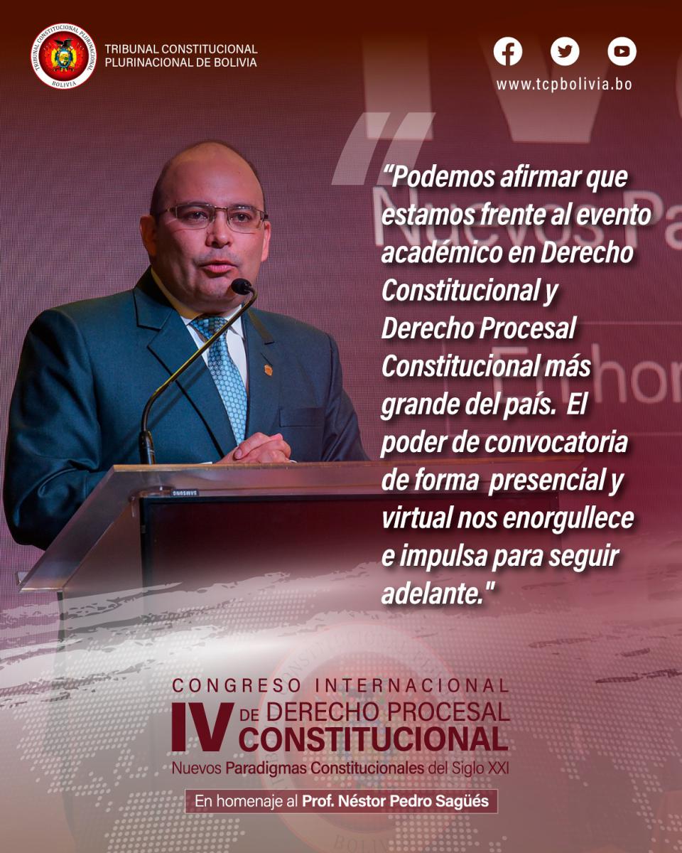 «Podemos afirmar que estamos frente al evento académico en Derecho Constitucional y Derecho Procesal Constitucional más grande del país El poder de convocatoria de forma presencial y virtual nos enorgullece e impulsa para seguir adelante». Palabras del Presidente del Tribunal Constitucional Plurinacional de Bolivia, MSc. Paul Enrique Franco Zamora, en el acto de inauguración del IV Congreso Internacional de Derecho Procesal Constitucional «Nuevos Paradigmas Constitucionales del Siglo XXI» en homenaje del reconocido jurista argentino, Nestor Pedro Sagüés.