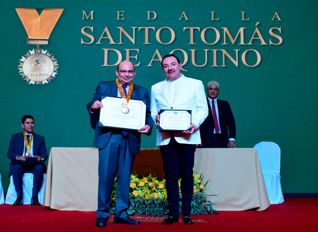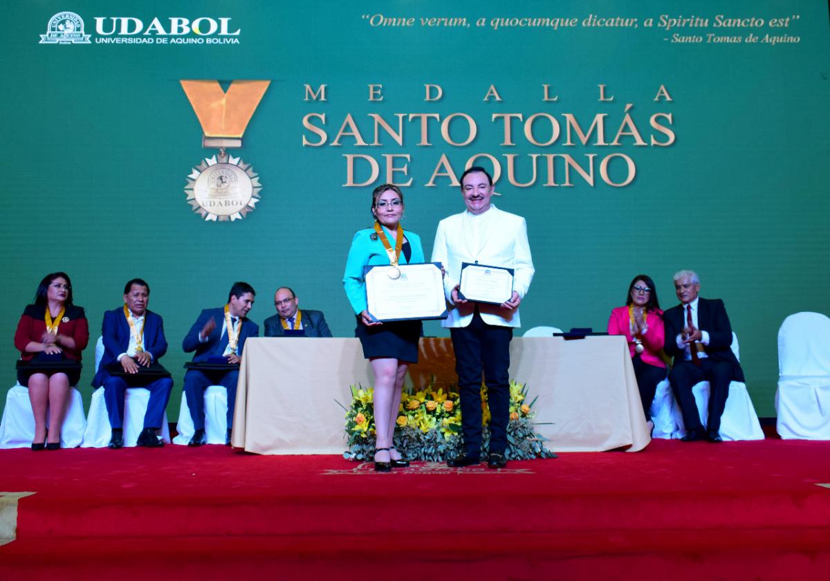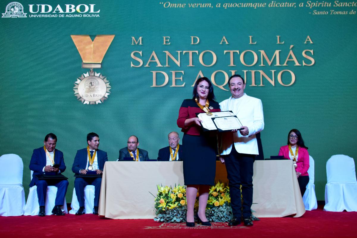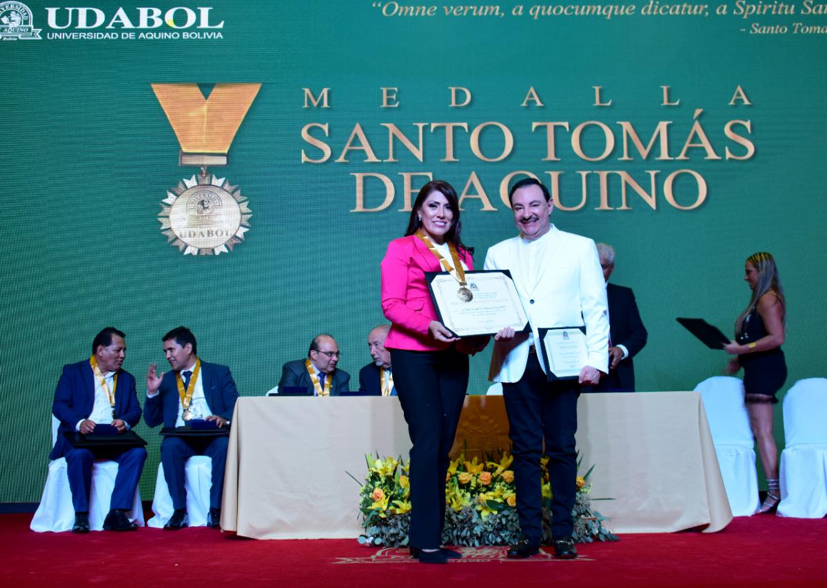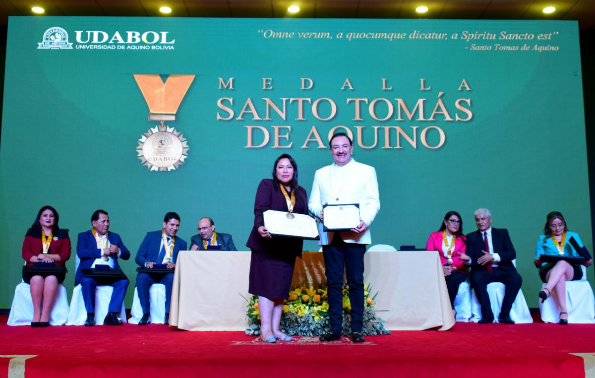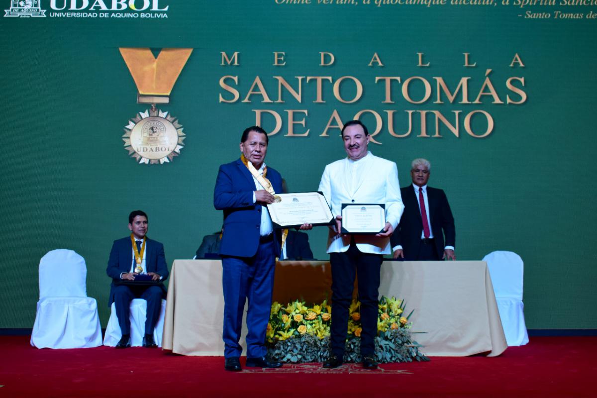 La Universidad de Aquino – Bolivia (UDABOL), otorgó la máxima distinción institucional, “Medalla Santo Tomas de Aquino” y un Certificado de Declaratoria de Visita Ilustre de la Entidad Académica de Estudios Superiores de la ciudad de Santa Cruz de la Sierra, al Presidente, Magistradas y Magistrados del Tribunal Constitucional Plurinacional, en ocasión de la realización del IV Congreso Internacional de Derecho Procesal Constitucional “Nuevos Paradigmas Constitucionales del Siglo XXI”, en homenaje al destacado profesor Néstor Pedro Sagüés.