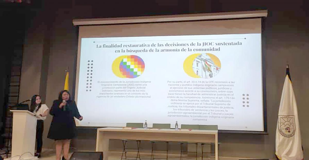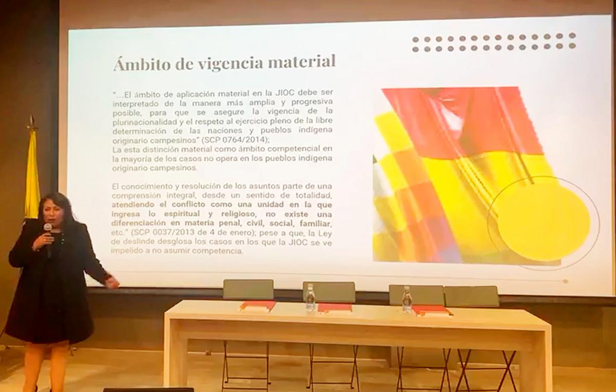 Durante su intervención, la autoridad explicó cómo el fortalecimiento de la Jurisdicción Indígena Originaria Campesina (JIOC) se constituye en una respuesta del Estado para materializar el derecho de acceso a la justicia, con criterios distintos a la administración de justicia occidental; resaltando su enfoque, principalmente en una justicia restaurativa tendiente a alcanzar la armonía de la comunidad.