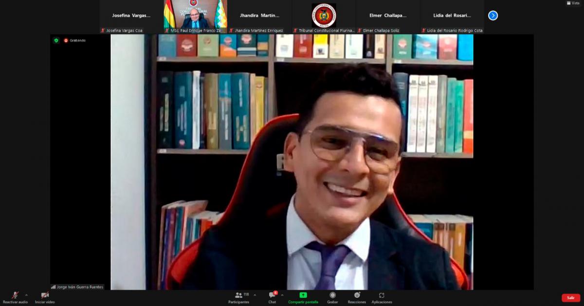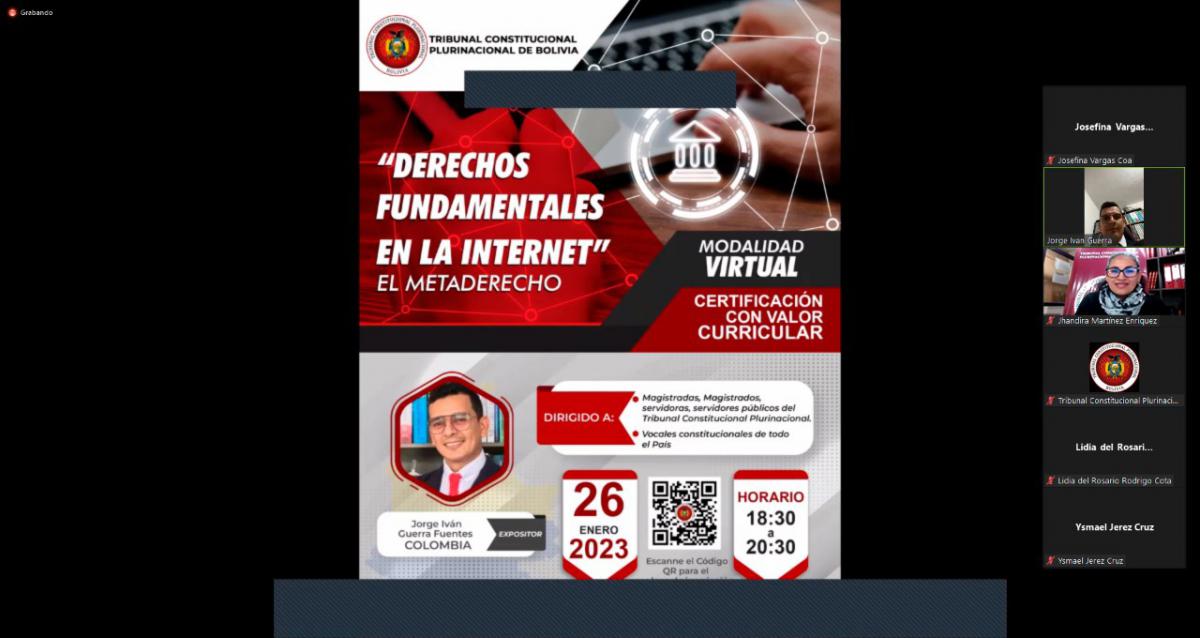 Dando continuidad al proceso de capacitación interna dirigido a autoridades, servidoras y servidores del Tribunal Constitucional Plurinacional de Bolivia (TCP), Presidencia de la Entidad, dio inicio al Plan Académico de la gestión 2023 con el curso virtual: “Derechos Fundamentales en la Internet». El Metaderecho, actividad académica que contó con la destacada participación desde Colombia, del MSc. Jorge Iván Guerra Fuentes, Especialista en Derecho Procesal, Justicia Constitucional y Tutela Jurisdiccional de los Derechos.