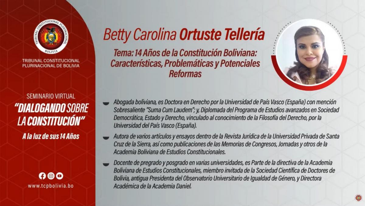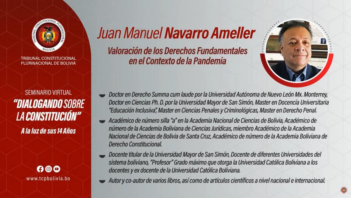 En la jornada de cierre, se destacó también la participación del Dr. Juan Manuel Navarro Ameller, con la temática “Valoración de los Derechos Fundamentales en el Contexto de la Pandemia”; del Dr. José Luis Cusi Alanoca, con el tema “El Intérprete Final de la Constitución. En busca de la Constitución Autoritativa”; del Dr. César Rojas Ríos, con la ponencia “Constitución y Anomia Social en Bolivia”; y de la Doctora Betty Carolina Ortuste Telleria, con la presentación denominada: “14 años de vigencia de la Constitución Boliviana: características, problemáticas y potenciales reformas”.