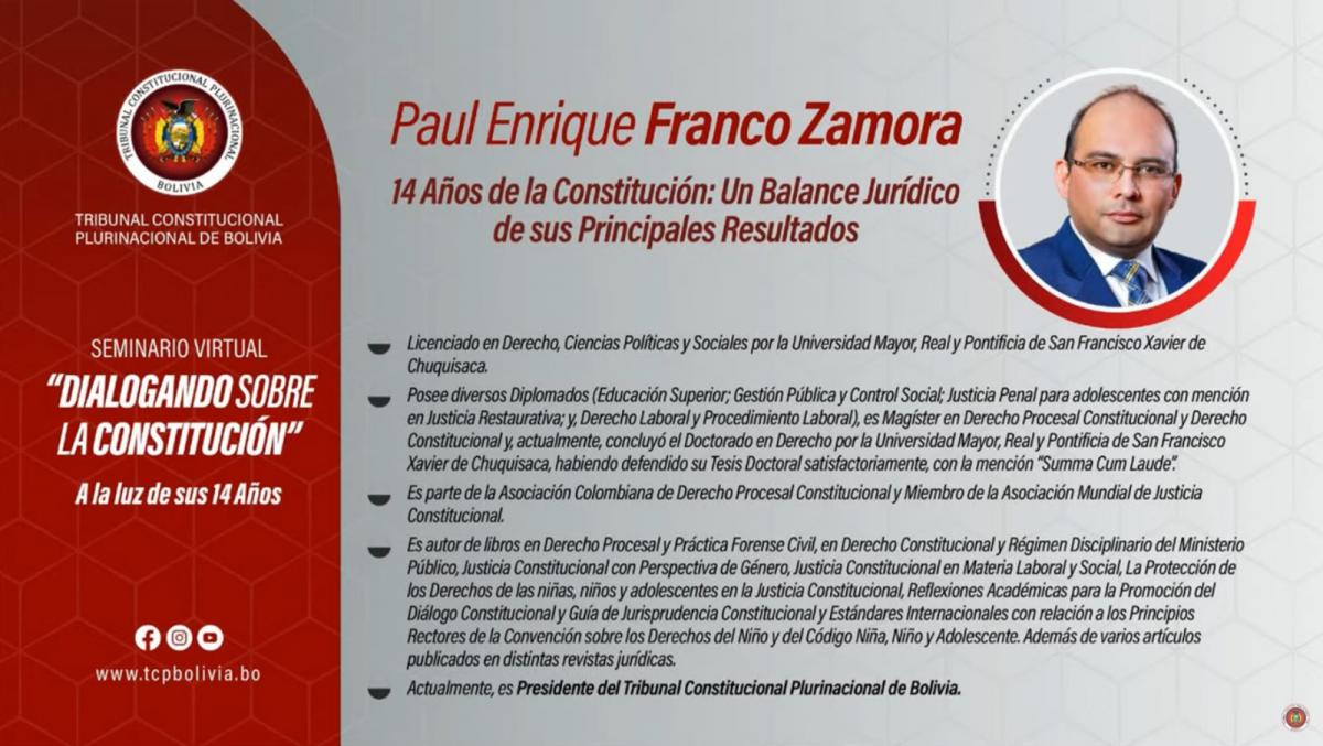 “La promulgación de la nueva Constitución Política del Estado presenta avances significativos en la transformación del país basada, principalmente, en la constitucionalización de nuevos derechos, la creación de entidades funcionales con una visión plural o el fortalecimiento de las instituciones ya existentes con el añadido de mayores atribuciones. Esta Norma Suprema posibilitó, al mismo tiempo, la incursión de un modelo autonómico, fundamentado en el reconocimiento de diferentes niveles de gobierno y con específicas competencias que apuntan al crecimiento equilibrado de todas las regiones de Bolivia”, señaló Franco Zamora durante la presentación de su exposición, “14 años de la Constitución: Un balance jurídico de sus principales resultados”.