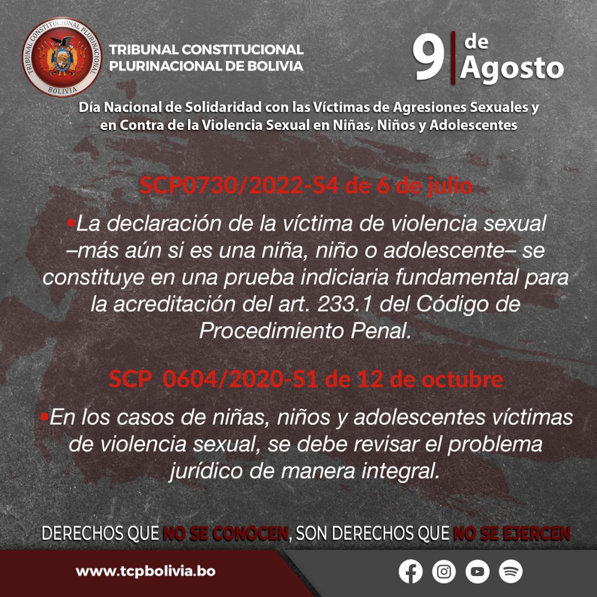 En el Día Nacional de Solidaridad con las Víctimas de Agresiones Sexuales y en Contra de la Violencia Sexual en Niñas, Niños y Adolescentes, el Tribunal Constitucional Plurinacional de Bolivia (TCP), pone a conocimiento las Sentencias Constitucionales Plurinacionales emitidas en resguardo de los derechos de la niñez y adolescencia, respecto a este tipo de violencia.
