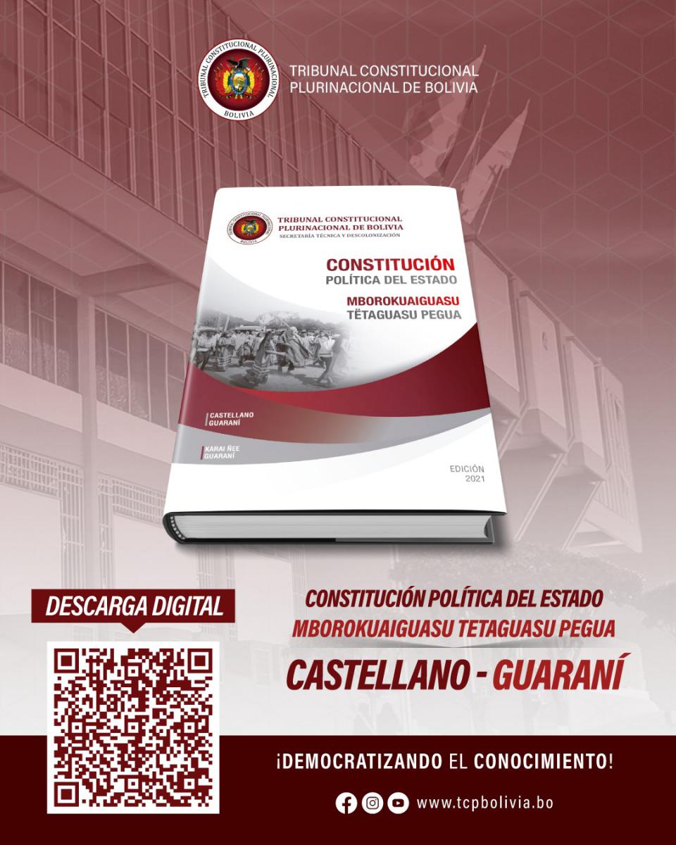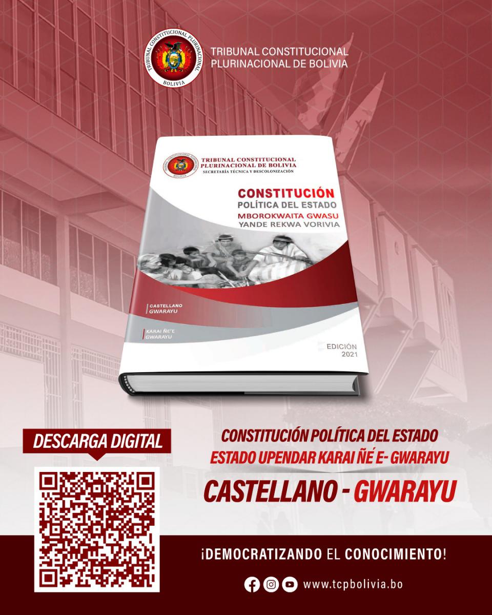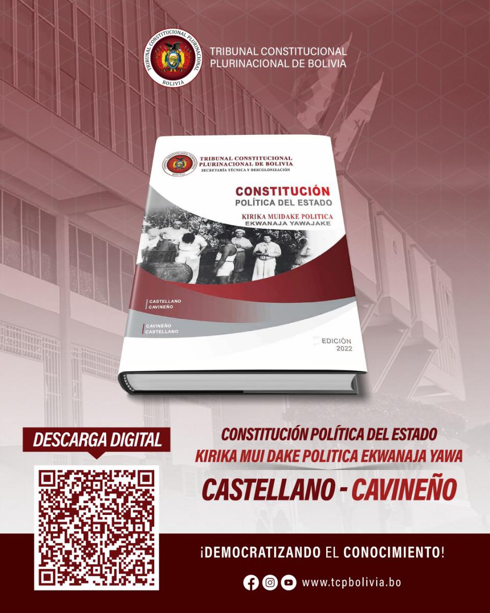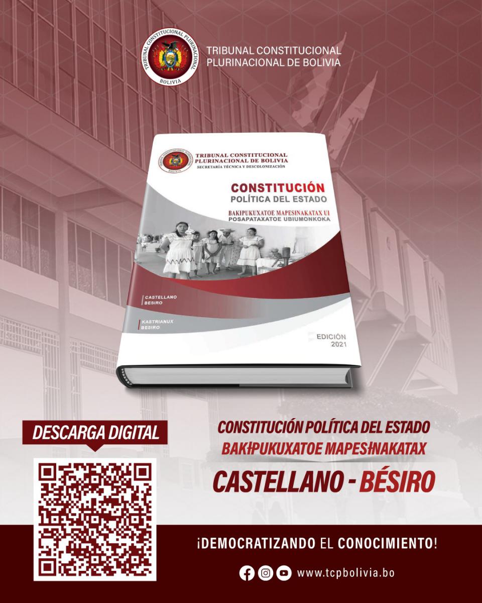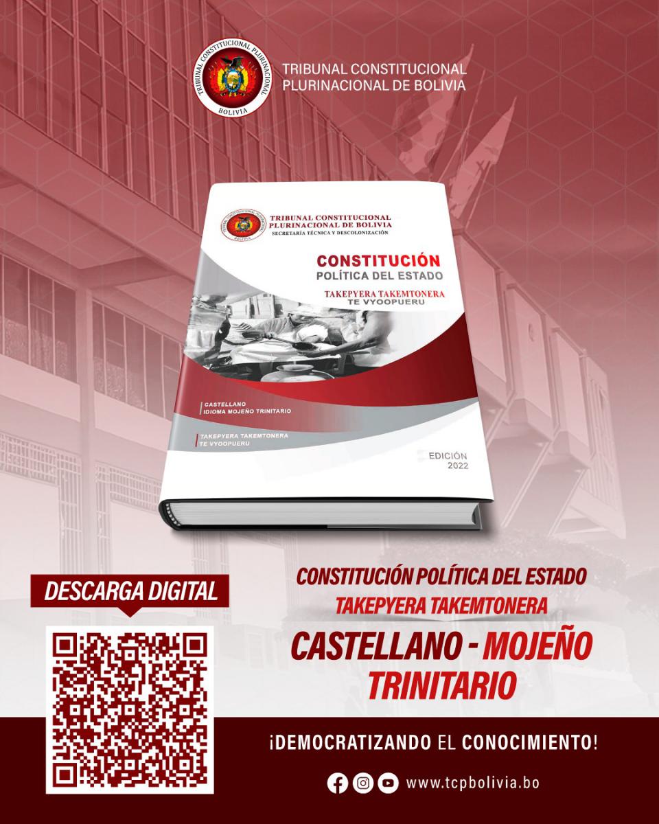 En el marco de realización del Seminario Virtual: “Dialogando sobre la Constitución”. A la Luz de sus 14 años, el Tribunal Constitucional Plurinacional de Bolivia (TCP), como Entidad que ejerce el control de constitucionalidad, garantiza la primacía de la Constitución, la vigencia y respeto de los derechos fundamentales de las personas, puso a disposición de la población, de forma gratuita y en versión digital, la Constitución Política del Estado (CPE) en Castellano y traducida a los idiomas: Quechua, Aymara, Guaraní, Gwarayu, Bésiro, Cavineño y Mojeno Trinitario.
