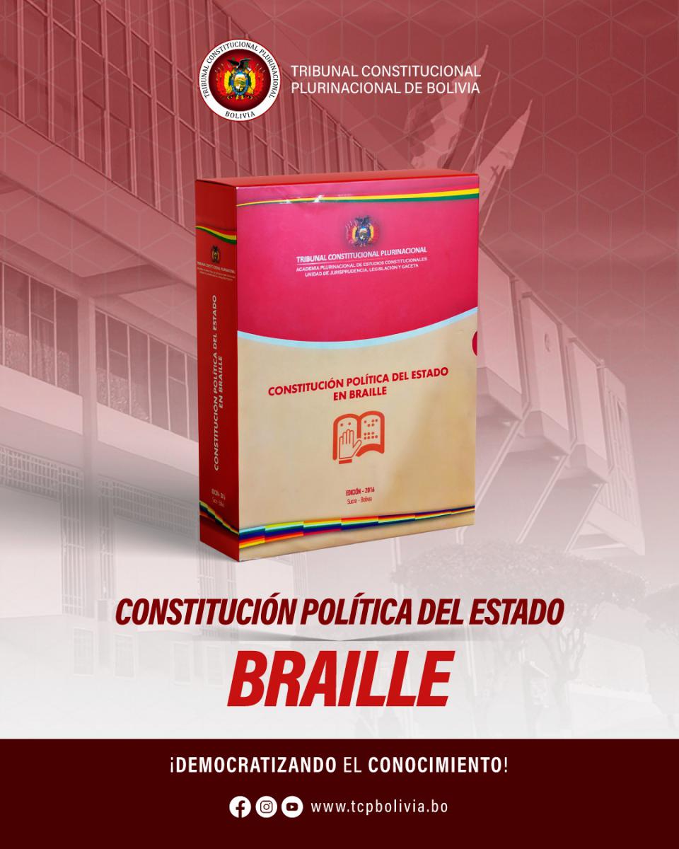 Además, el Tribunal Constitucional Plurinacional, ha publicado la CPE en braille, sistema de lectura y escritura táctil pensado para personas con discapacidad visual, documento que cuenta con más de 40 páginas, dividida en dos tomos.