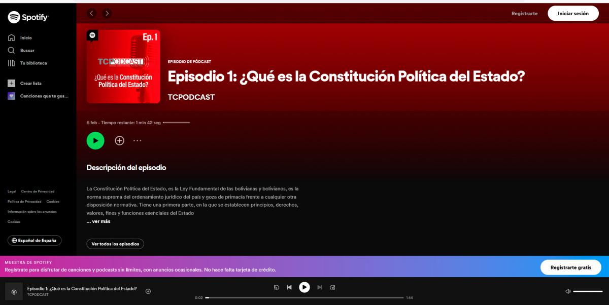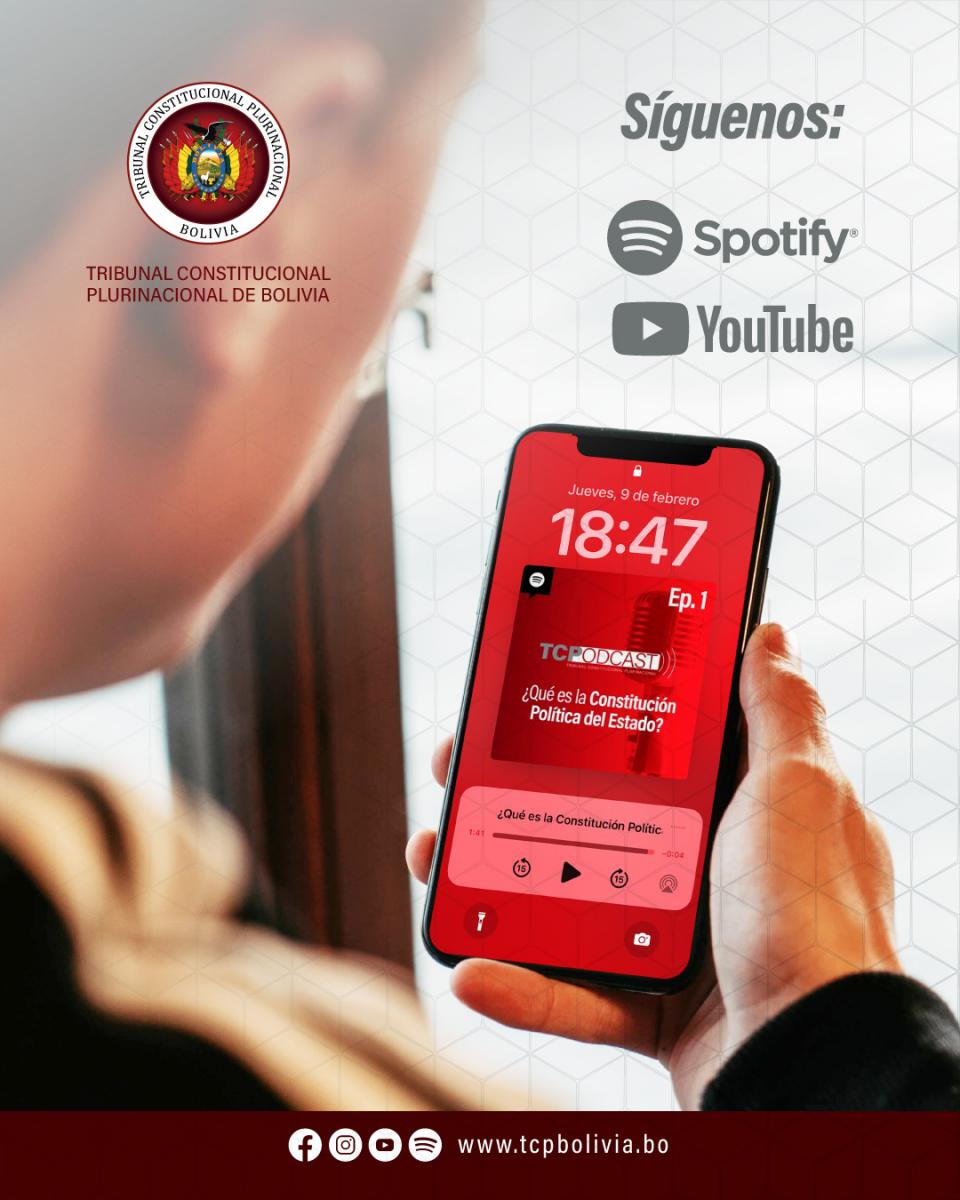 Para conocer más acerca de este trabajo, la Entidad invita a la ciudadanía a seguir la cuenta TCPODCAST del Tribunal Constitucional Plurinacional de Bolivia en Spotify, y escuchar el primer episodio denominado: ¿Qué es la Constitución Política del Estado?, presentado el 7 de octubre, a propósito del evento académico desarrollado en conmemoración de los 14 años de promulgación de la principal norma del ordenamiento jurídico boliviano.
