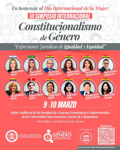 El Tribunal Constitucional Plurinacional de Bolivia y el Comité de Género del Órgano Judicial y TCP, te invitan a participar del III Simposio Internacional. Constitucionalismo de Género: «Expresiones Juridicas de Igualdad y Equidad». Expositoras y expositores de: Argentina, Brasil, Colombia, Paraguay