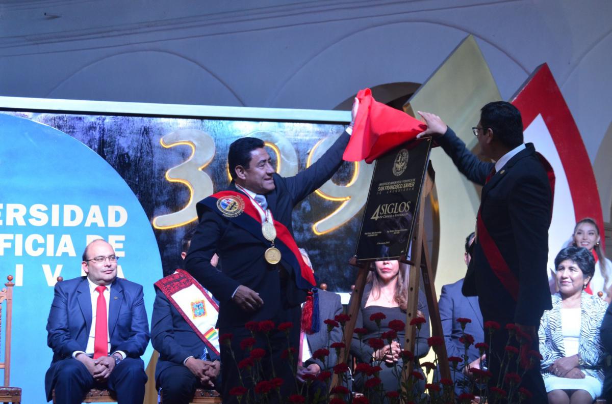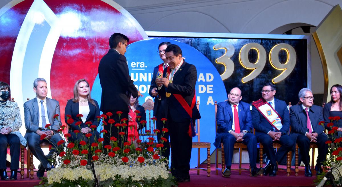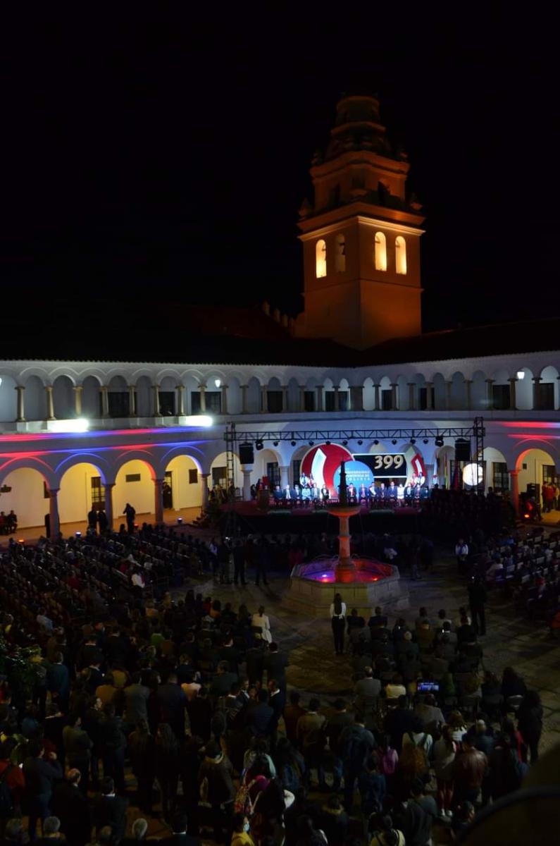 La actividad se desarrolló hoy, 27 de marzo 2023, en el patio de la Facultad de Derecho, bajo el lema: “Rumbo a los cuatro siglos de ciencia e innovación”, donde sus principales autoridades realizaron el descubrimiento de la placa conmemorativa de los 399 años de vida institucional, además otorgaron el anillo de oro al mejor estudiante de la Carrera de Idiomas y egresado de la Carrera de Medicina, Erick Rolando Calizaya; convocando también a la familia universitaria para continuar trabajando en beneficio de Chuquisaca y Bolivia.