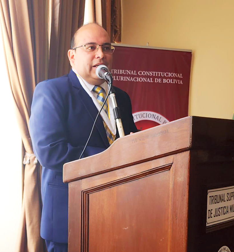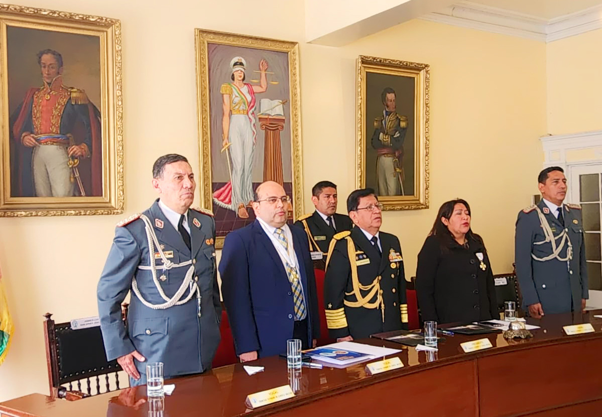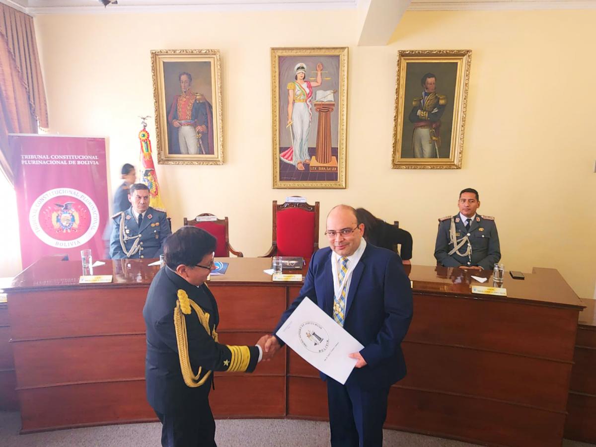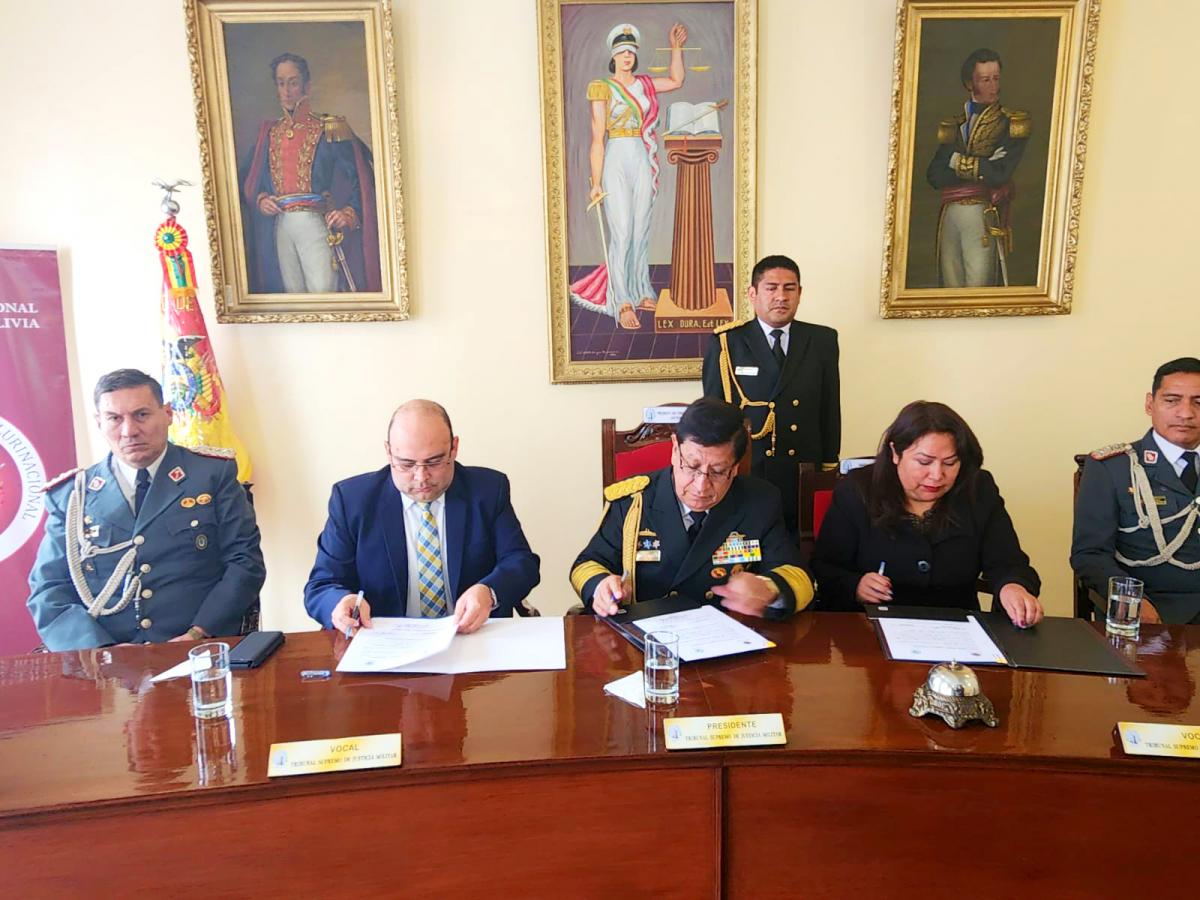 El Presidente del Tribunal Constitucional Plurinacional de Bolivia (TCP), Ph.D. Paul Enrique Franco Zamora, la Magistrada MSc. Brigida Celia Vargas Barañado y el Almirante (S.P.) Víctor Baldivieso Hache, Presidente del Tribunal Supremo de Justicia Militar, suscribieron en la ciudad de la Paz, el 4 de abril de 2023, un Convenio Marco de Cooperación Interjurisdiccional.