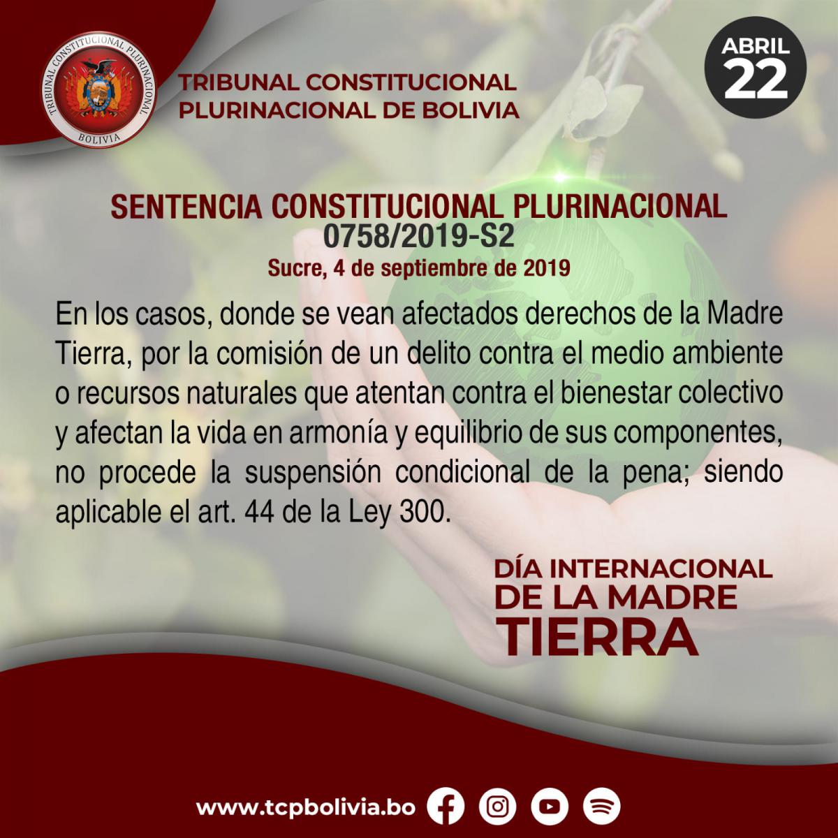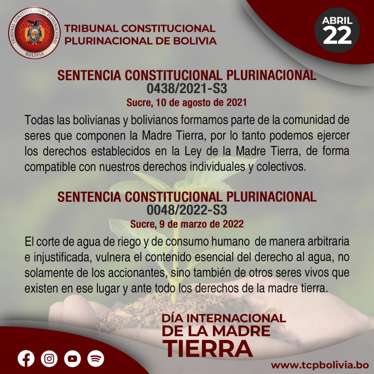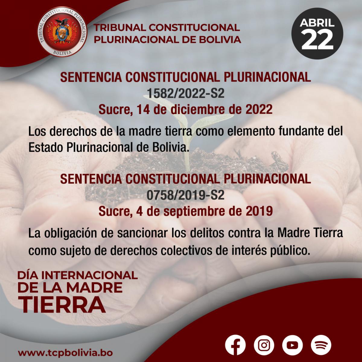 DÍA INTERNACIONAL DE LA MADRE TIERRA, SENTENCIAS CONSTITUCIONALES PLURINACIONALES Publicación de la entrada:22 de abril de 2023 Categoría de la entrada:Noticias En el Día Internacionales de la Madre Tierra damos a conocer las Sentencias Constitucionales Plurinacionales emitidas por el Tribunal Constitucional Plurinacional de Bolivia.“Derechos que no se conocen, son derechos que no se ejercen» Etiquetas: Noticias Leer más artículos Entrada anteriorTCP RECIBE LA VISITA DE ESTUDIANTES DE LA UNIVERSIDAD PRIVADA DOMINGO SAVIO (UPDS) SEDE POTOSÍ Siguiente entradaLA MAGISTRADA ELIZABETH CORNEJO GALLARDO RINDIÓ HOMENAJE A LOS 206 AÑOS DE LA BATALLA DE LA TABLADA EN TARIJA También podría gustarte PRESIDENTE DEL TRIBUNAL CONSTITUCIONAL PLURINACIONAL, MSC, PAUL ENRIQUE FRANCO ZAMORA, SOSTIENE REUNIÓN CON PAULO ABRÃO, ESPECIALISTA EN DERECHOS HUMANOS Y EX SECRETARIO EJECUTIVO DE LA COMISIÓN INTERAMERICANA DE DERECHOS HUMANOS -CIDH 10 de agosto de 2022 COMUNICADO 30 de abril de 2025 EN LA CIUDAD DE TARIJA: MAGISTRADA ELIZABETH CORNEJO GALLARDO DESARROLLA LA CONFERENCIA MAGISTRAL «ACCESO JUSTICIA CONSTITUCIONAL PLURAL» 20 de junio de 2022