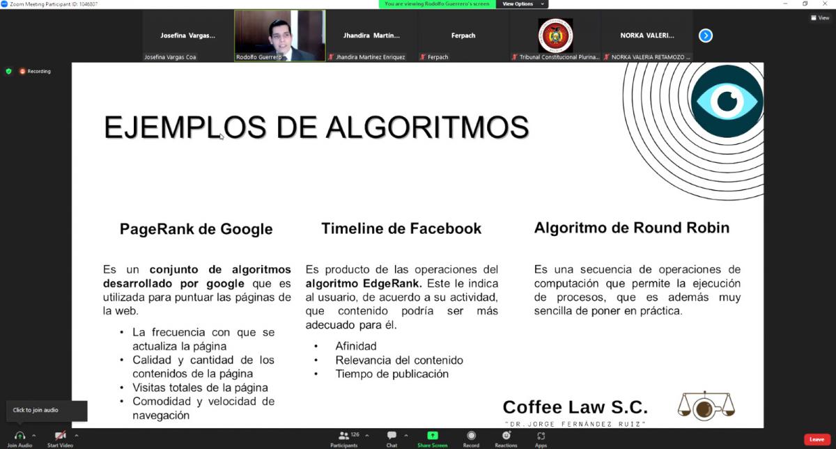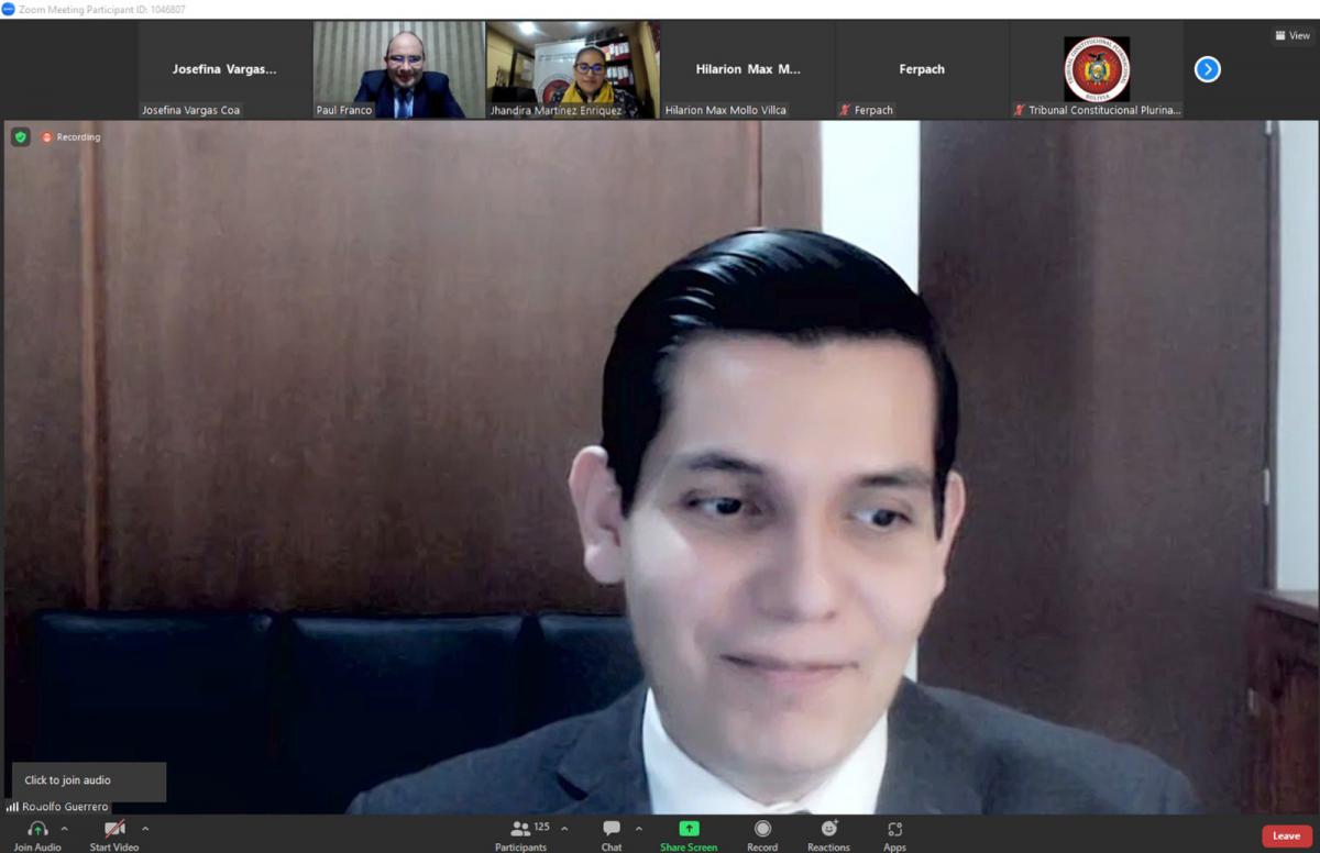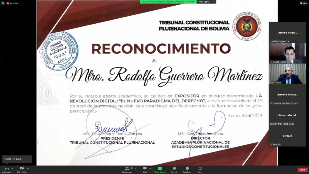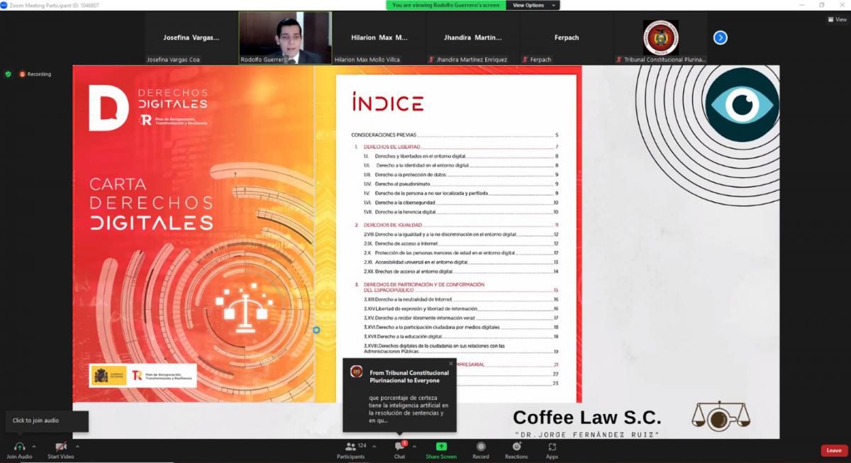 En el marco del proceso de capacitación interna, el Tribunal Constitucional Plurinacional (TCP) realizó esta jornada el curso virtual denominado: “La Revolución Digital: El Nuevo Paradigma del Derecho”, con la participación del expositor Rodolfo Guerrero Martínez, Maestro en Derecho con orientación en materia Constitucional y Administrativo por la benemérita Universidad de Guadalajara -México.