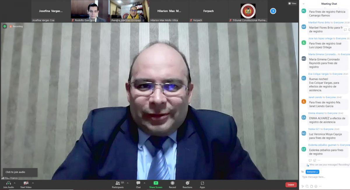El Presidente de la Entidad, Ph.D. Paul Enrique Franco Zamora, en el momento de inaugurar la actividad académica, informó que en cumplimiento de la política institucional de fortalecimiento del talento humano, de forma mensual se desarrolla un curso de capacitación a través del Aula Virtual de la Academia Plurinacional de Estudios Constitucionales del TCP, con la participación de expertos docentes internacionales que proponen la reflexión y el análisis de temas orientados al quehacer institucional.