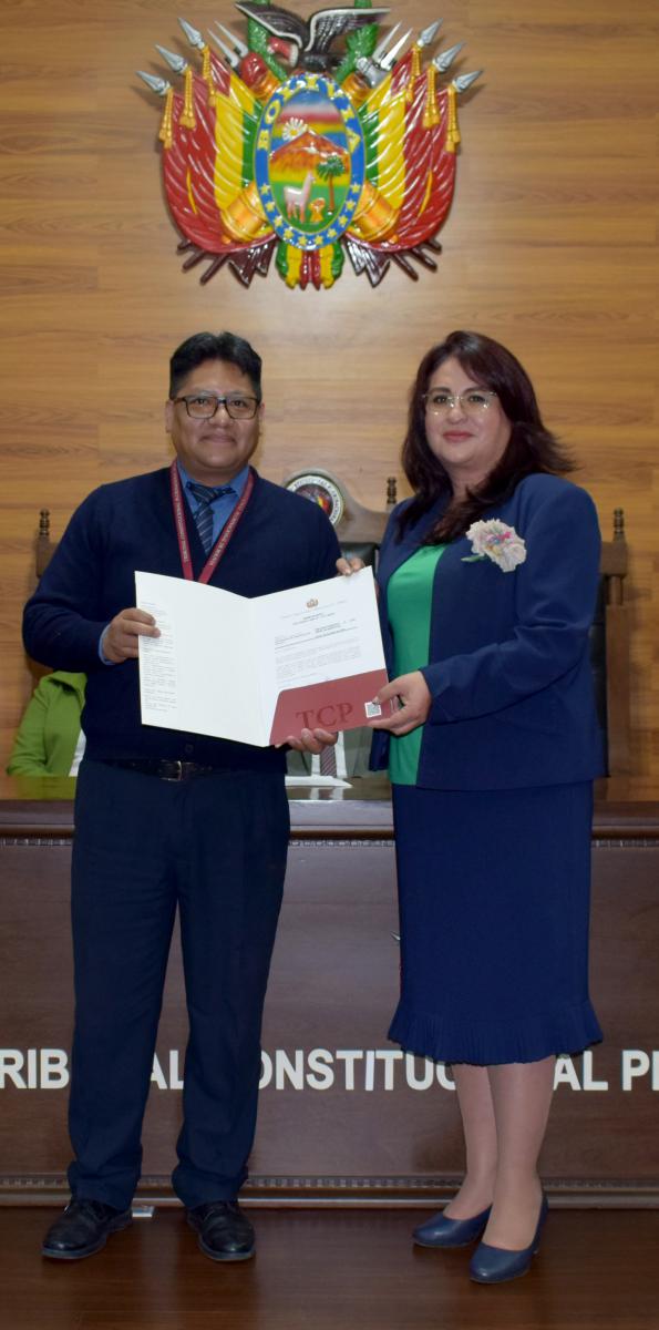 Durante el desarrollo del acto, el Presidente del TCP hizo entrega de una plaqueta de reconocimiento a Marisol Columba Gacha, servidora pública de la institución que viene cumpliendo funciones de manera continua e ininterrumpida a lo largo de 20 años, y junto a la autoridad, en homenaje al 1 de Mayo, las Magistradas MSc. Karem Lorena Gallardo Sejas y MSc. Julia Elizabeth Cornejo Gallardo, efectuaron la entrega de certificados de distinción al personal destacado de la institución.