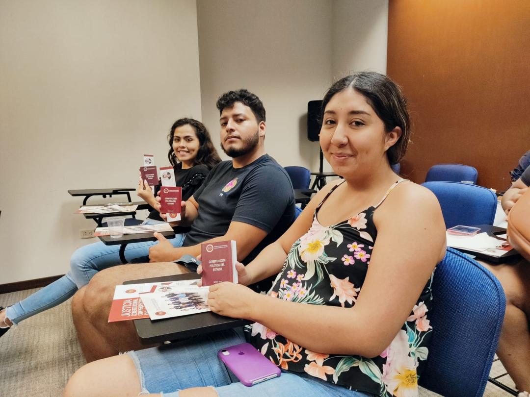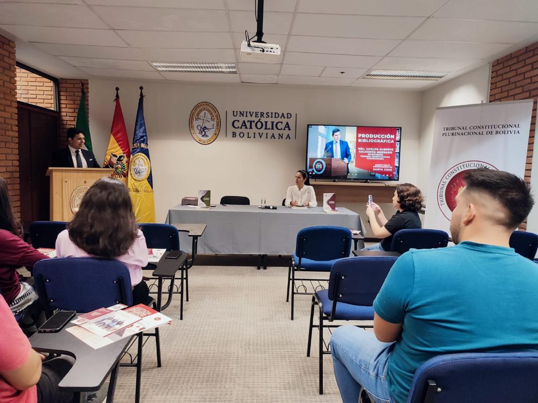 La presentación de la publicación realizada de forma presencial en el auditorio de la Casa de Estudios Superiores, contó con la asistencia de la Directora de la Carrera de Derecho, Dra. Fabiola Valenzuela Viera y estudiantes de diferentes cursos, a quienes el Magistrado Calderón hizo entrega de la Constitución Política del Estado, boletines informativos cartillas, trípticos y regletas, material institucional que contribuye a la difusión de la norma principal del pueblo boliviano y del accionar del TCP.